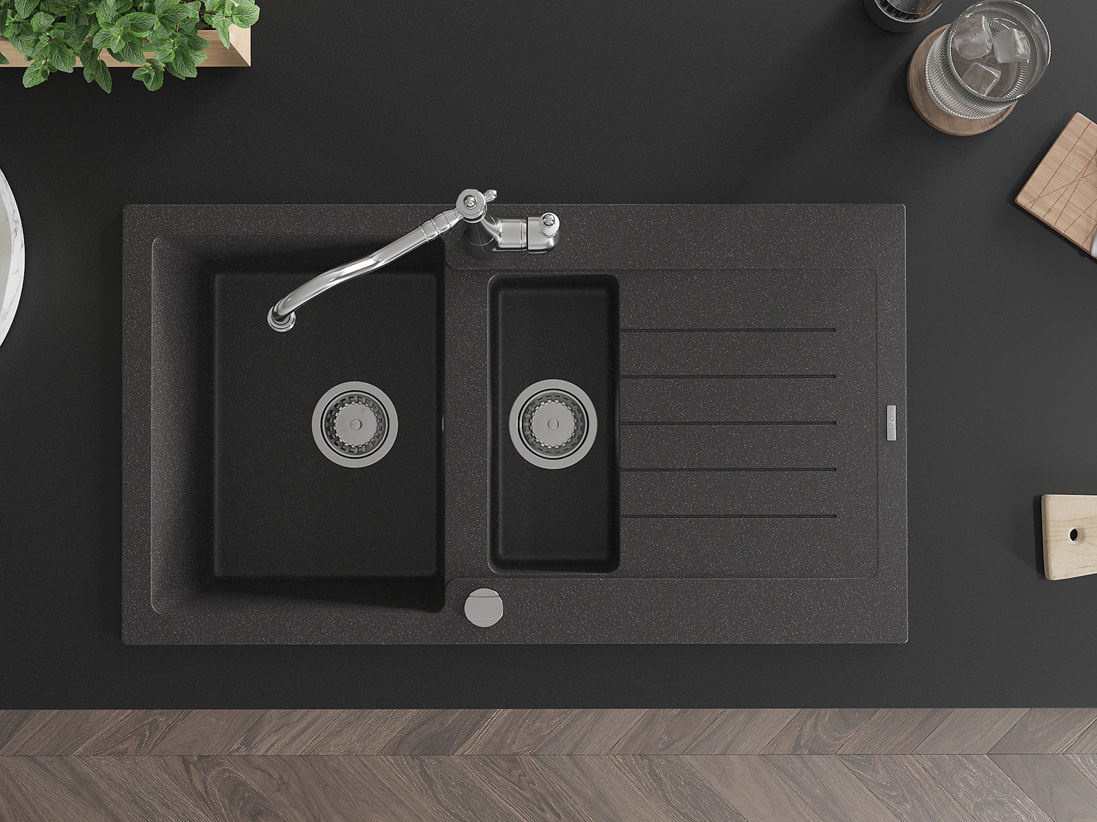 Datorită sistemului de montare universală, chiuveta este reversibilă, iar scurgerea poate fi montată pe blat la stânga sau la dreapta. În acest fel, puteți ajusta cu ușurință pagina la nevoile și condițiile dvs.