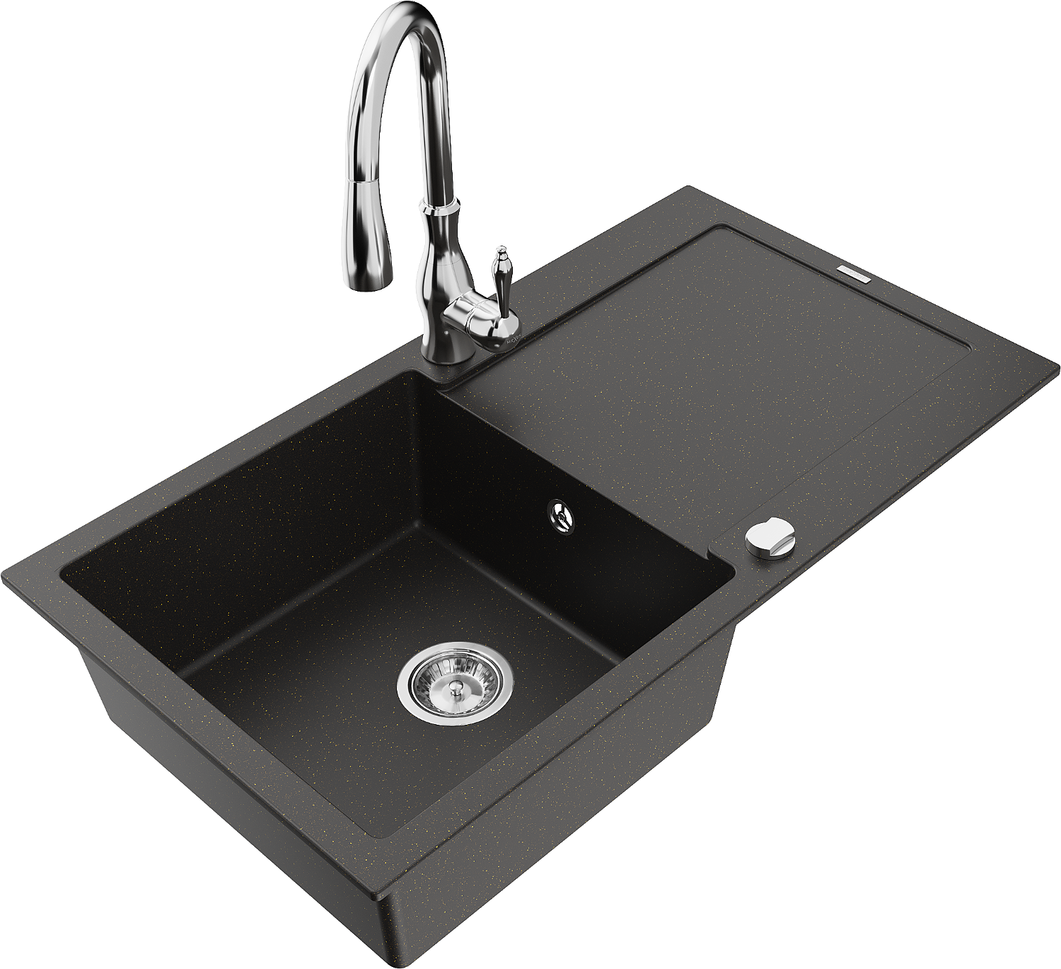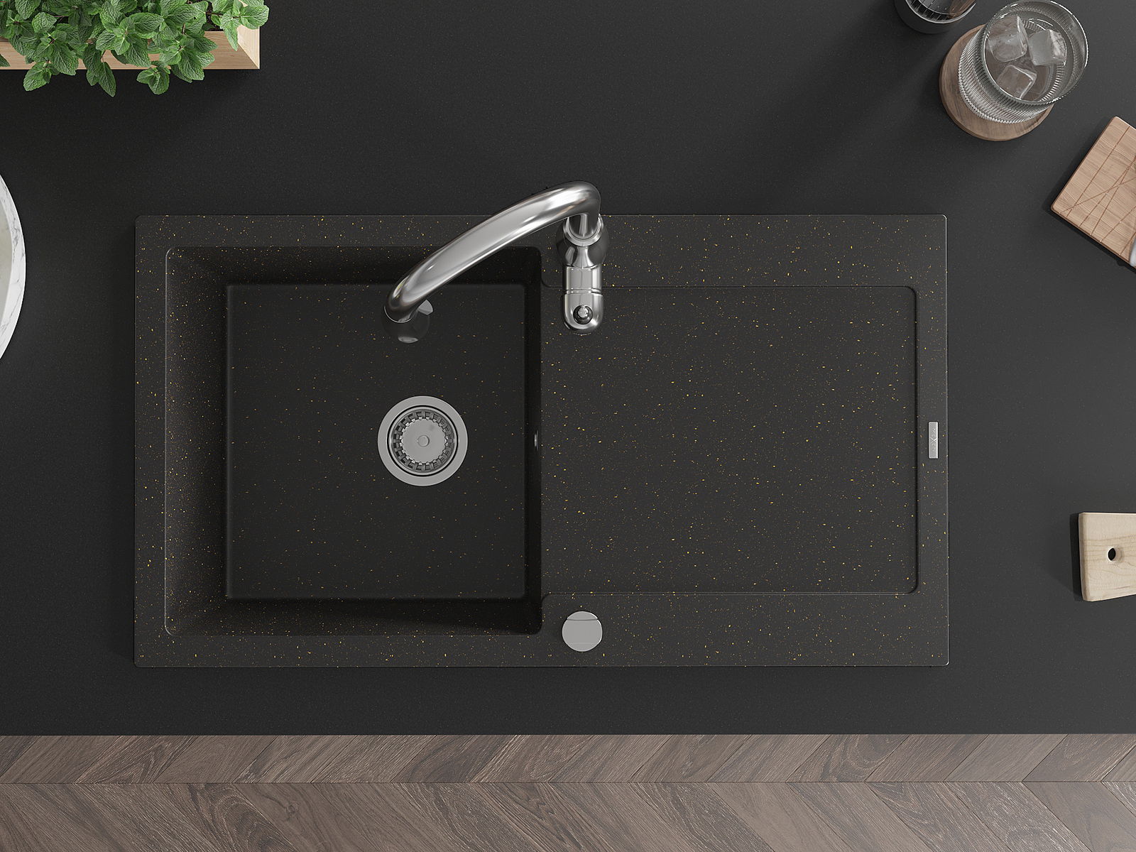 Mexen Leo chiuvetă de granit cu 1 compartiment cu picurător și baterie de bucătărie Savita, negru/auriu metalizat