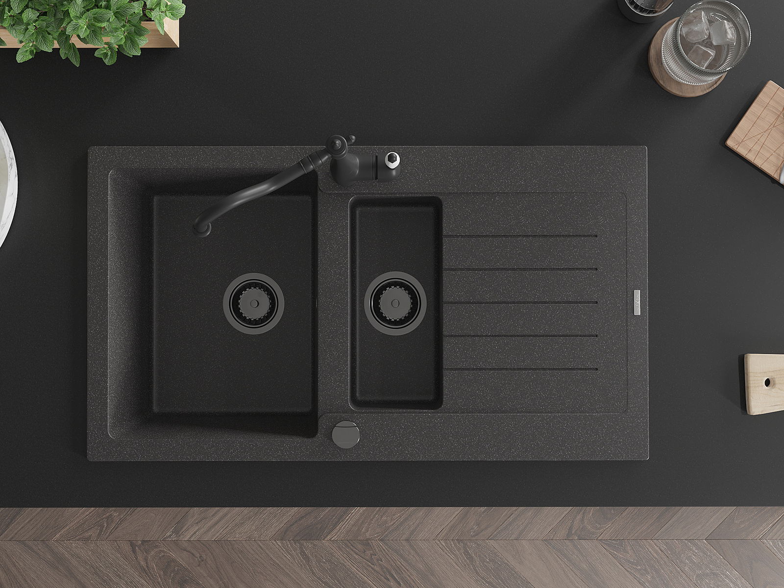 Mexen Matias chiuvetă de granit cu 1,5 compartimente cu scurgător și baterie de bucătărie Carla, negru cu stropi