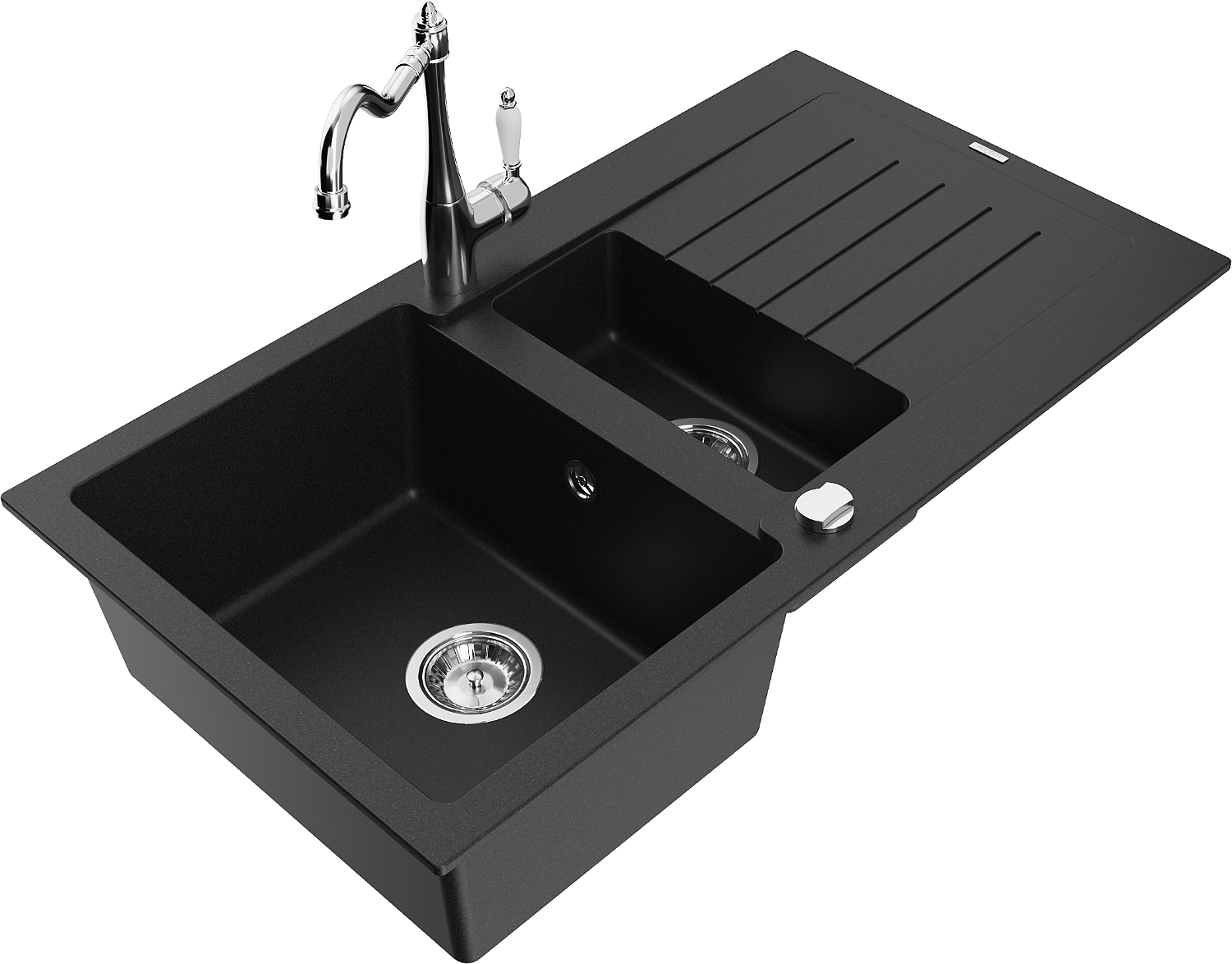 Mexen Matias chiuvetă din granit, cu 1,5 cuve și scurgător, cu baterie de bucătărie Carla, negru - 6502-77-670700-00