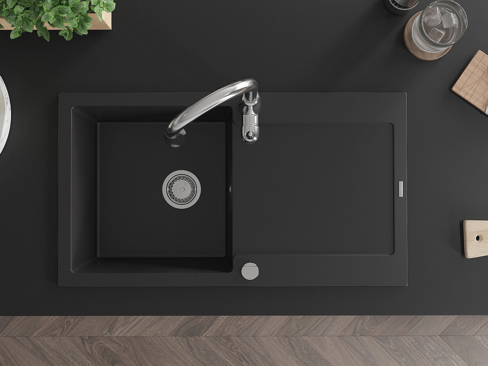 Mexen Leo chiuvetă de bucătărie din granit cu o cuvă și scurgător și baterie de bucătărie Savita, negru - 6501-77-672601-00