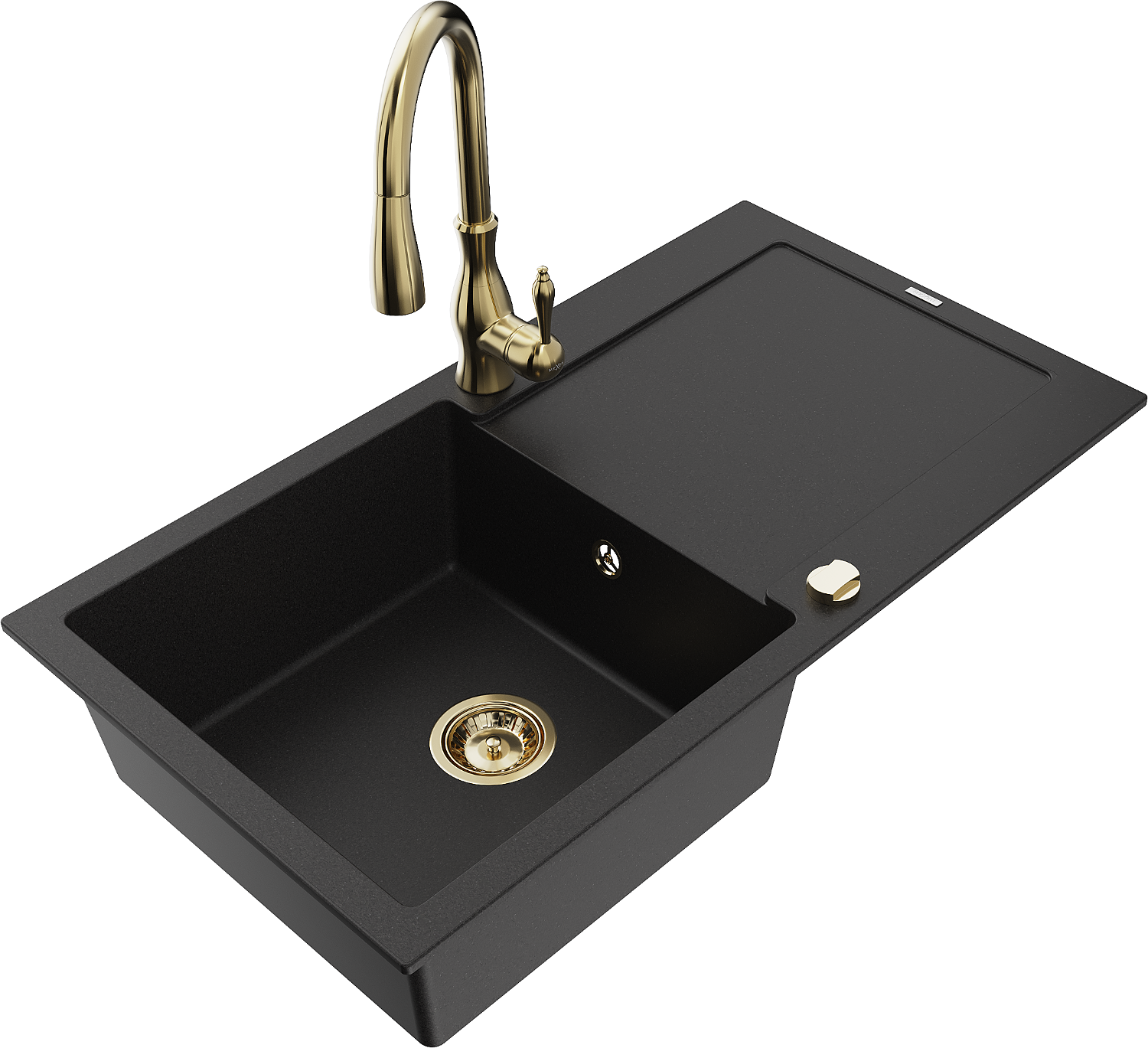 Mexen Leo chiuvetă de bucătărie din granit cu 1 compartiment și scurgător și robinet de bucătărie Savita, negru - 6501-77-67260?