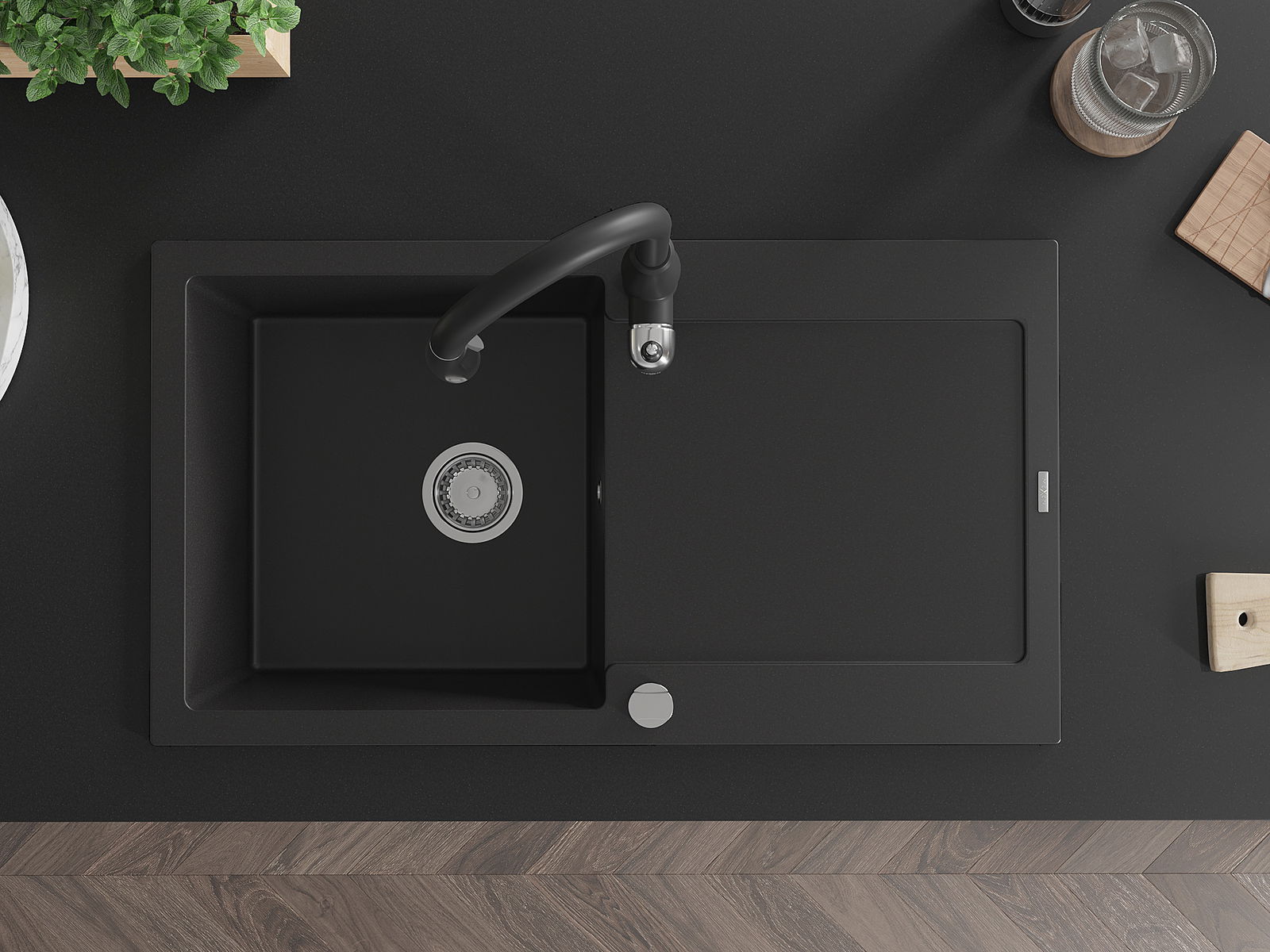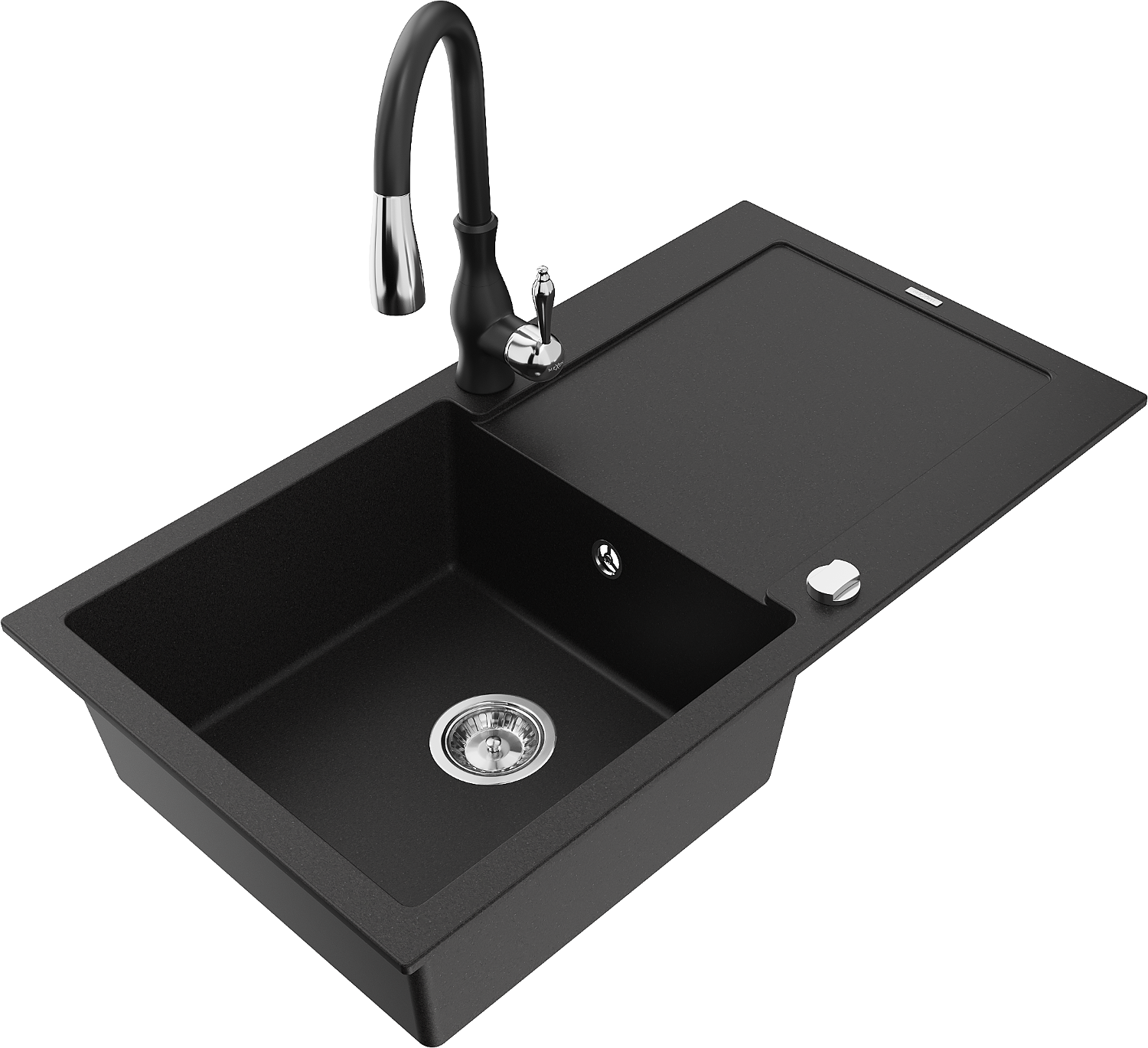 Mexen Leo chiuvetă de bucătărie din granit cu 1 compartiment cu scurgător și baterie Savita, negru - 6501-77-672601-70