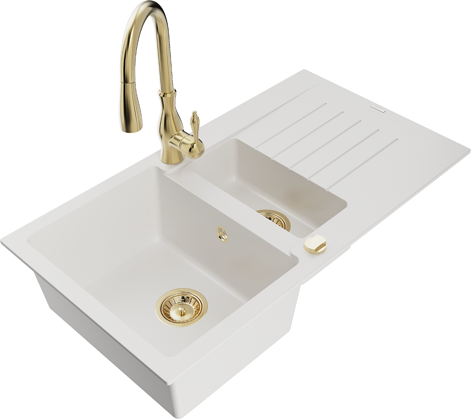 Mexen Matias chiuvetă de bucătărie din granit cu 1,5 compartimente cu scurgător și baterie de bucătărie Savita, alb - 6502-20-6?