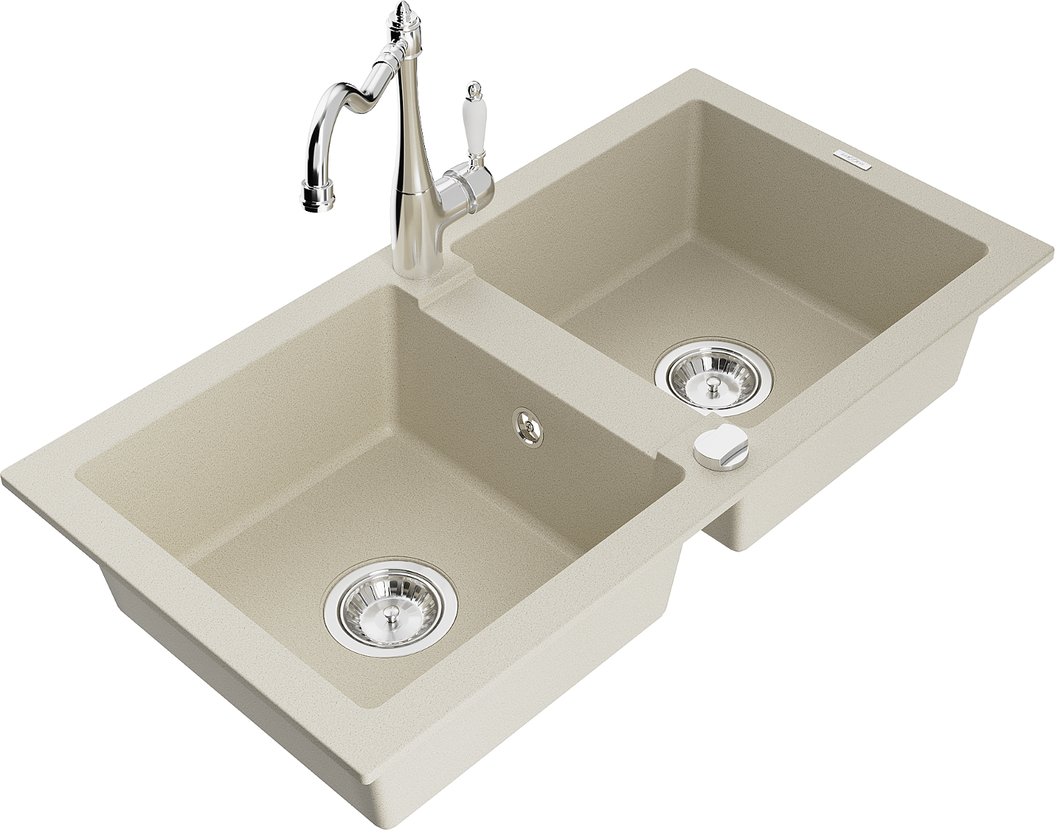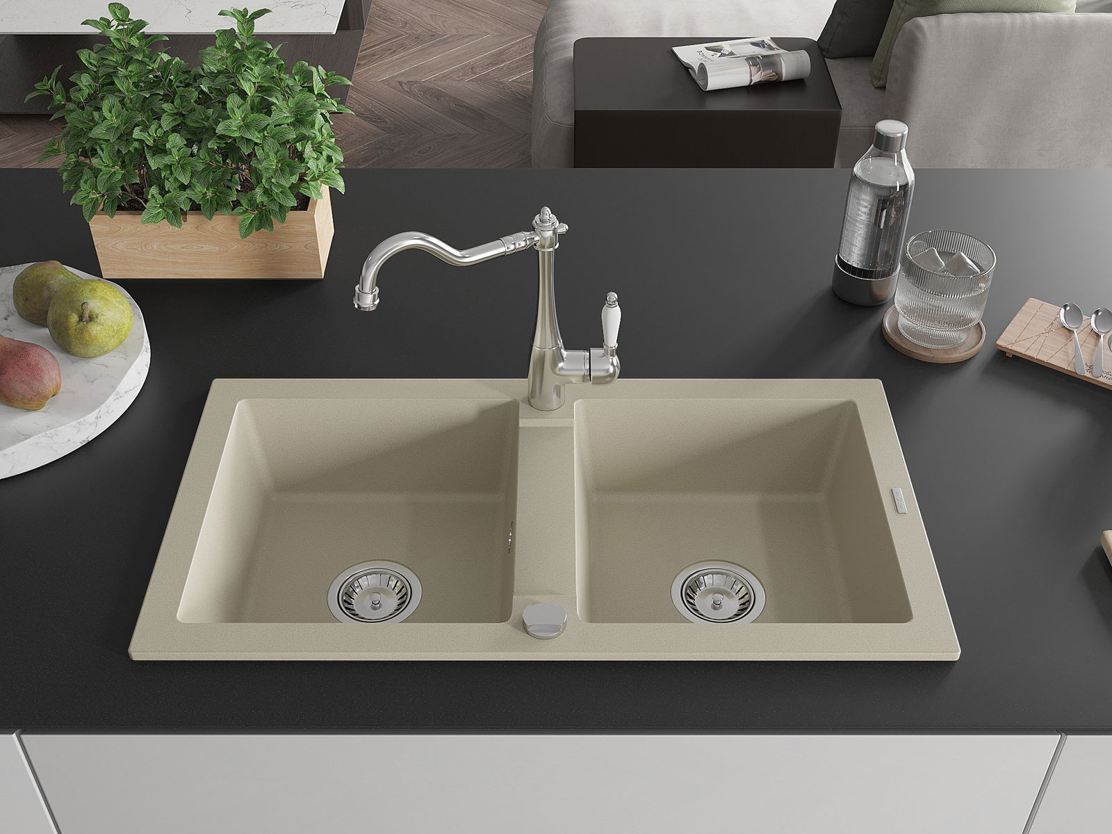Mexen Mario chiuvetă de bucătărie din granit cu 2 cuve și baterie de bucătărie Carla, bej - 6504-69-670700-00