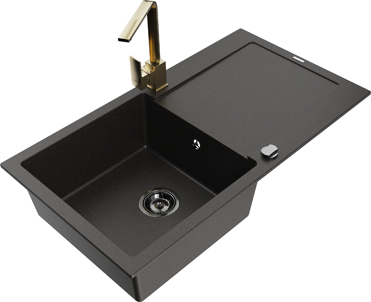 Chiuvetă de granit Mexen Leo cu o cuvă, cu picurător și baterie de bucătărie Rita, negru/auriu metalic - 6501-75-670300-50-B