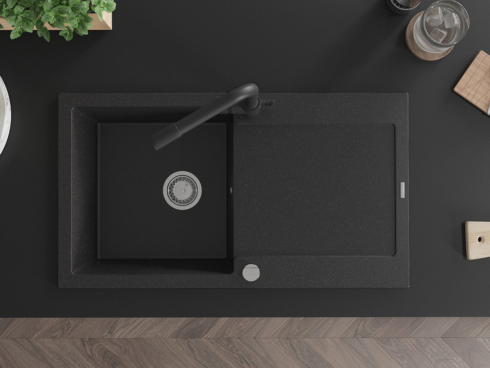 Mexen Leo chiuvetă de bucătărie din granit cu 1 compartiment cu picurător și baterie Duero, negru/argintiu metalizat