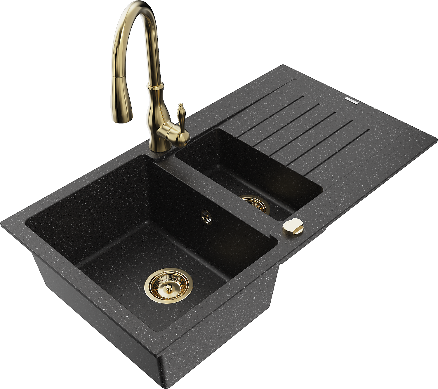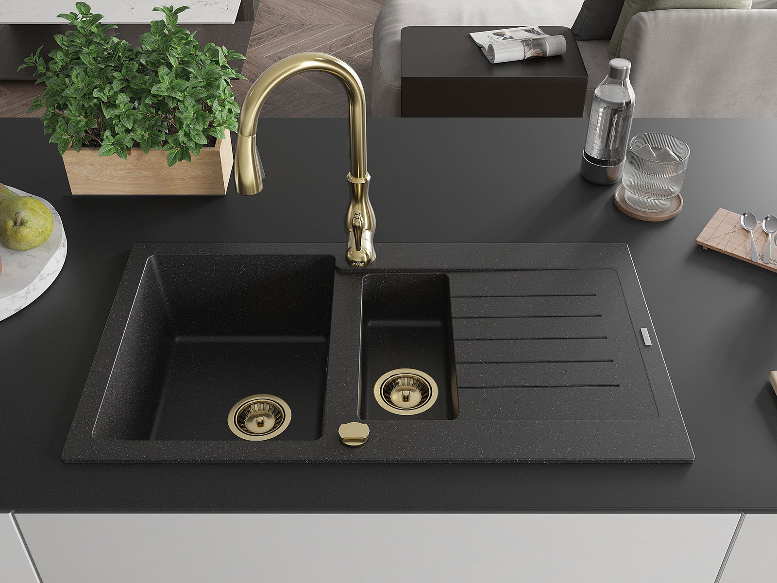 Mexen Matias chiuvetă granit 1,5 compartimente cu scurgător și baterie de bucătărie Savita, negru/argintiu