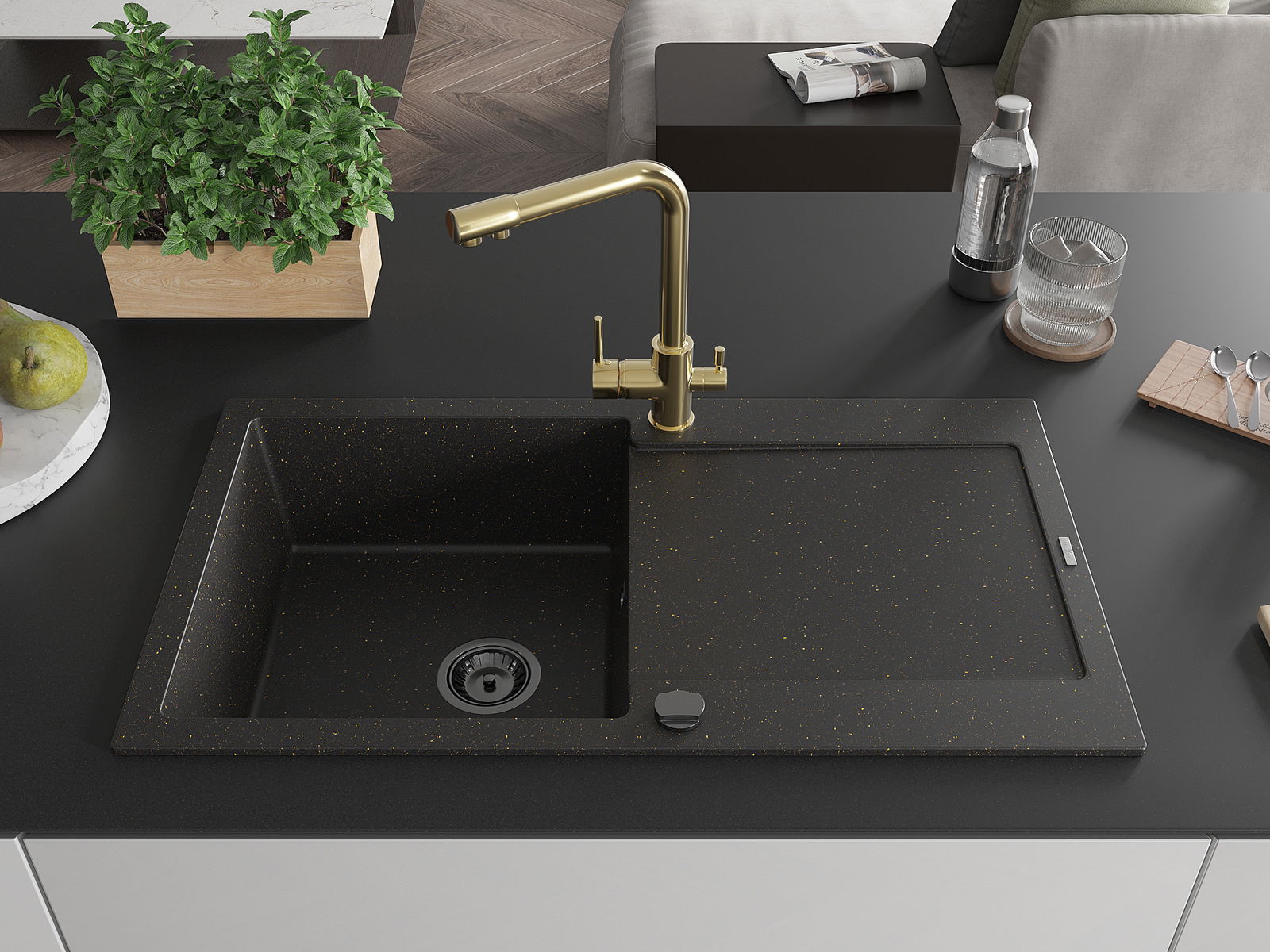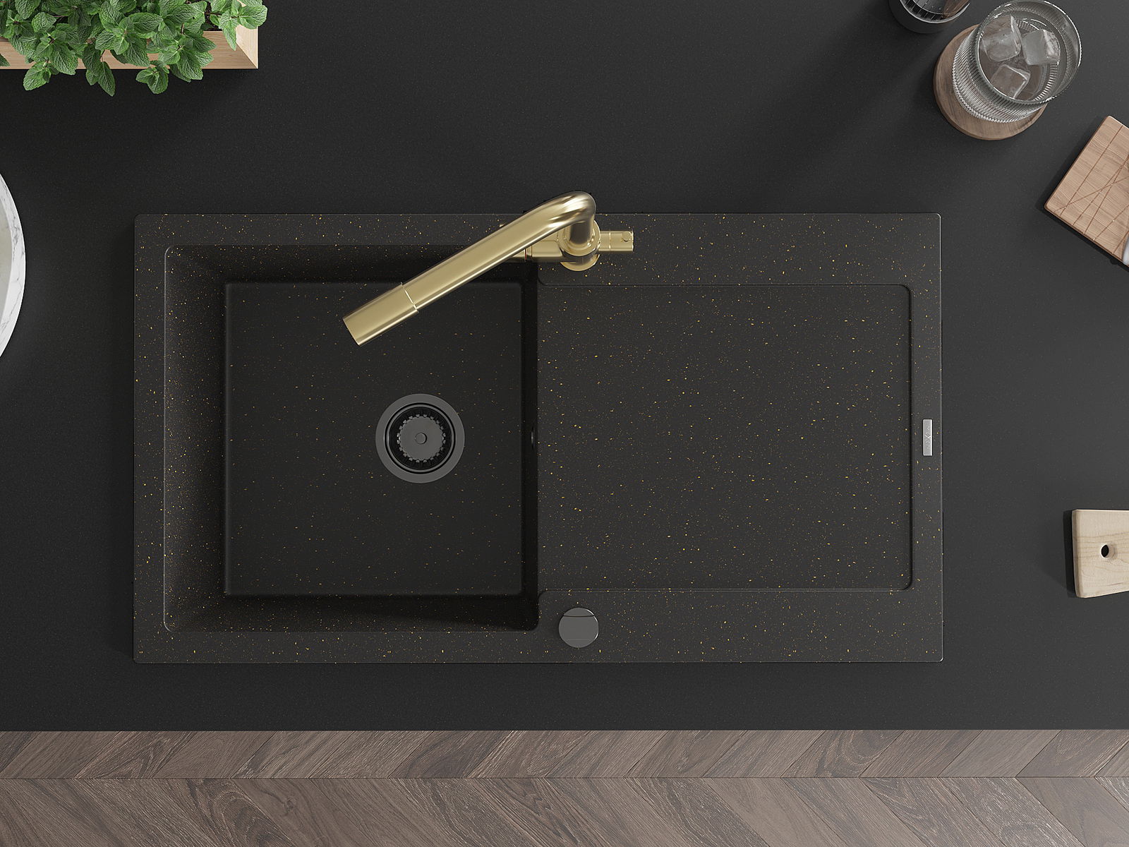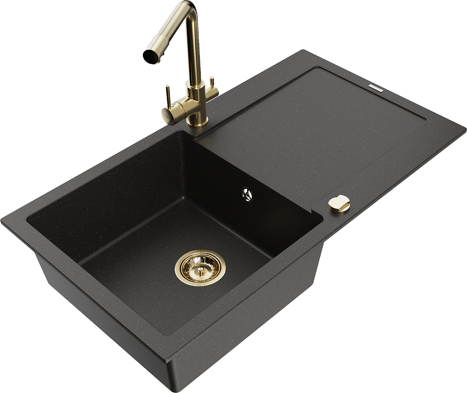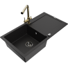 Mexen Leo chiuvetă din granit cu 1 compartiment cu scurgător și baterie de bucătărie Duero, negru/auriu metalizat