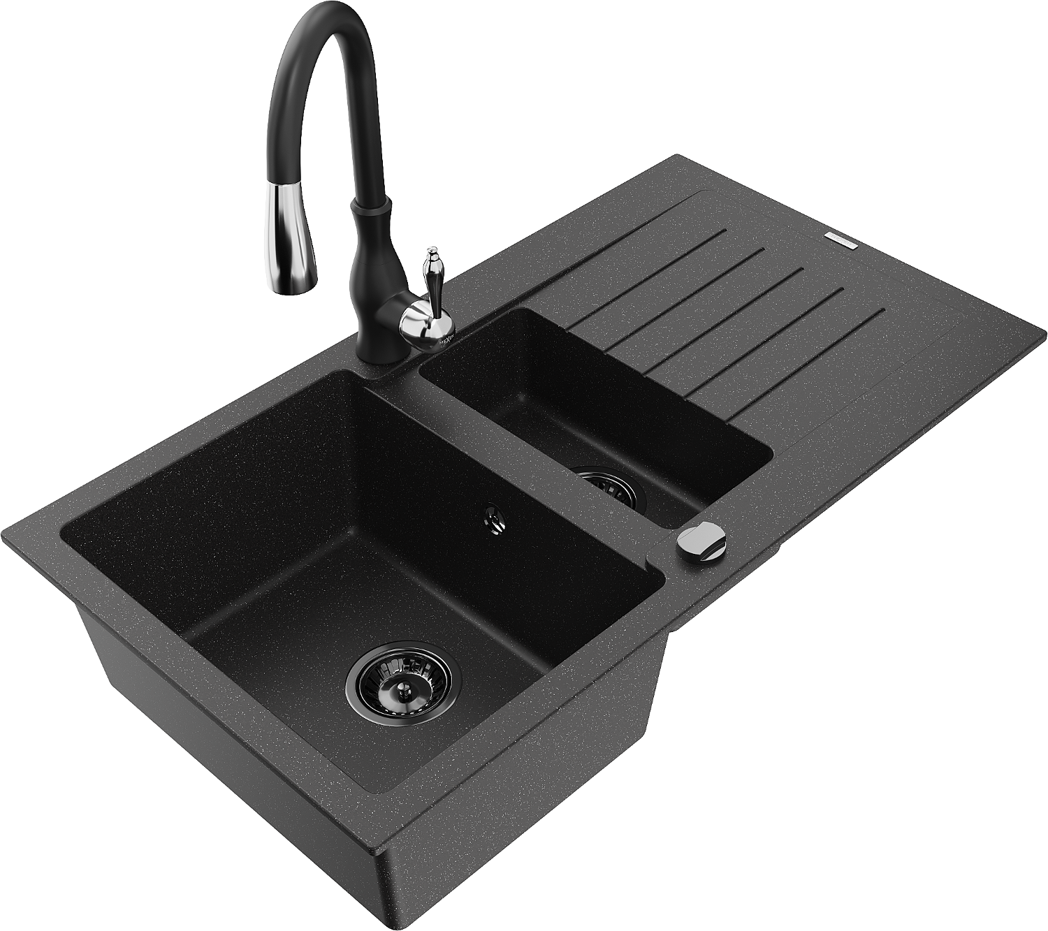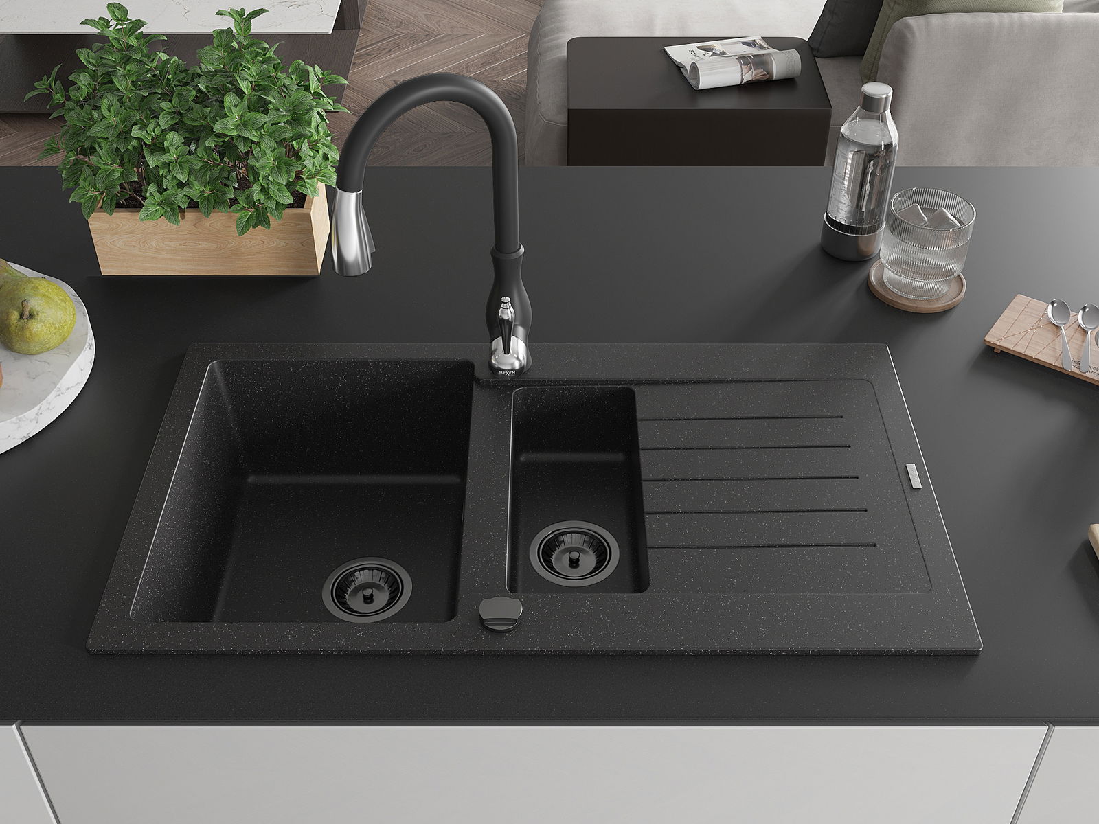 Mexen Matias chiuvetă de bucătărie din granit cu 1,5 cuve, cu scurgător și baterie Savita, negru/argintiu