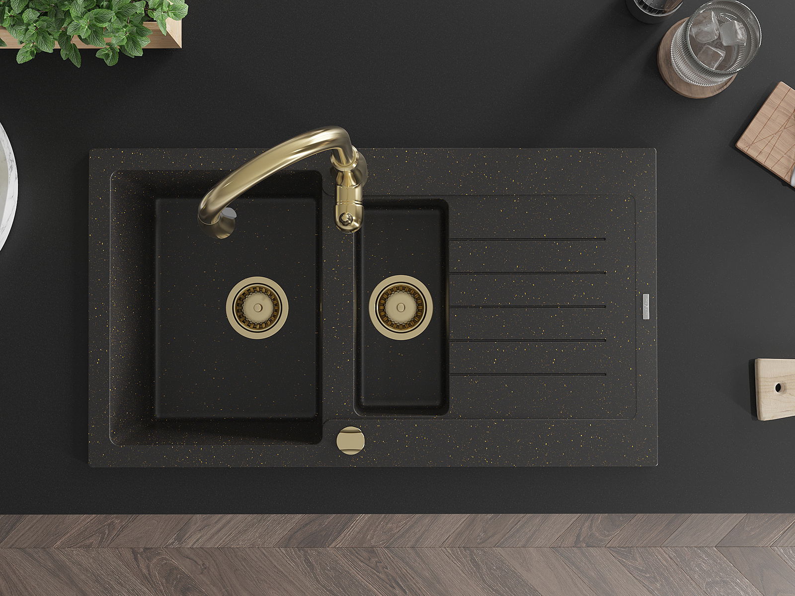Mexen Matias chiuvetă de granit cu 1,5 cuve cu scurgător și robinet de bucătărie Savita, negru/auriu - 6502-75-672601-50