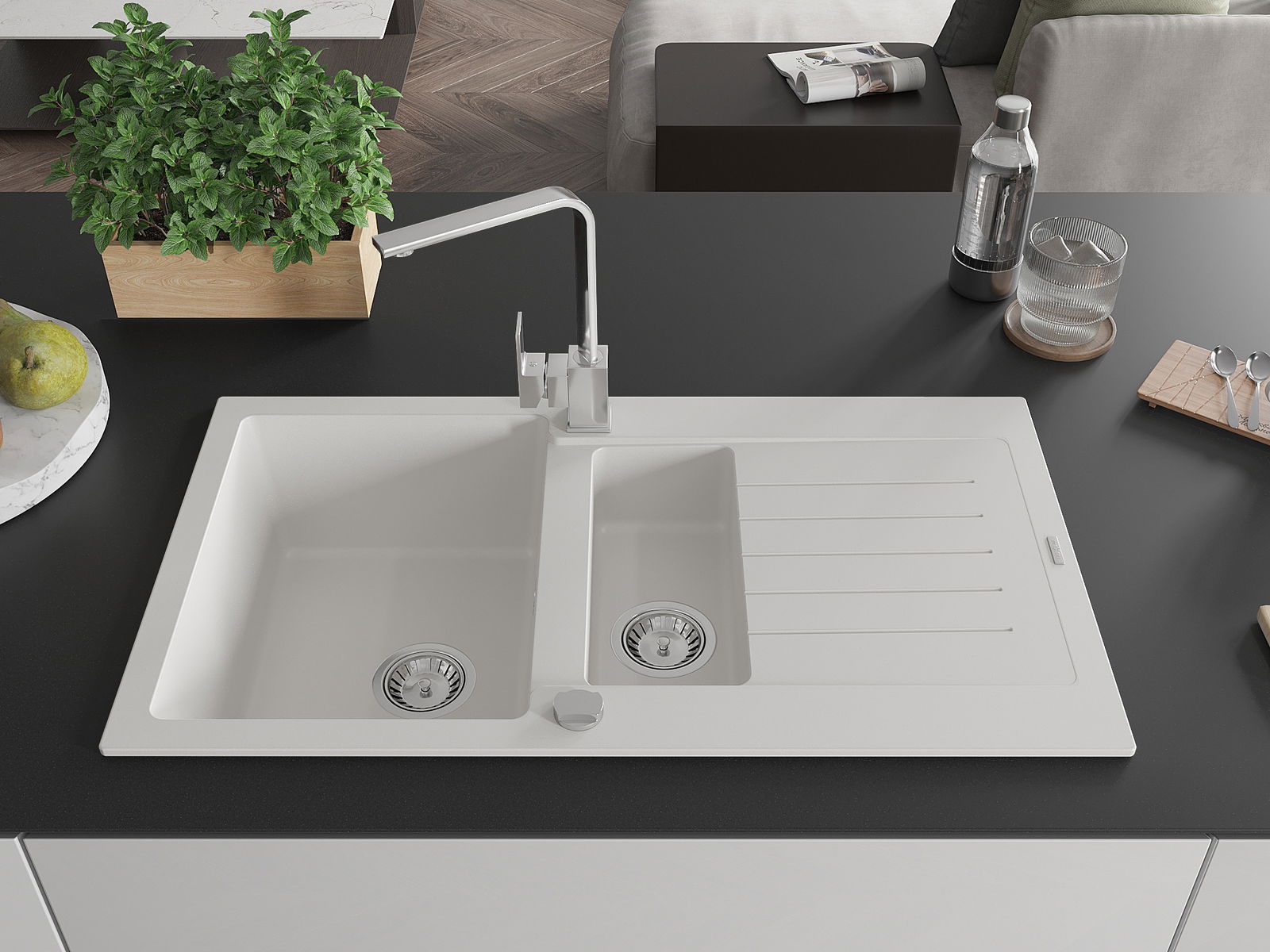 Mexen Matias chiuvetă de granit cu 1,5 cuve și scurgător, cu baterie de bucătărie Rita, alb - 6502-20-670300-00