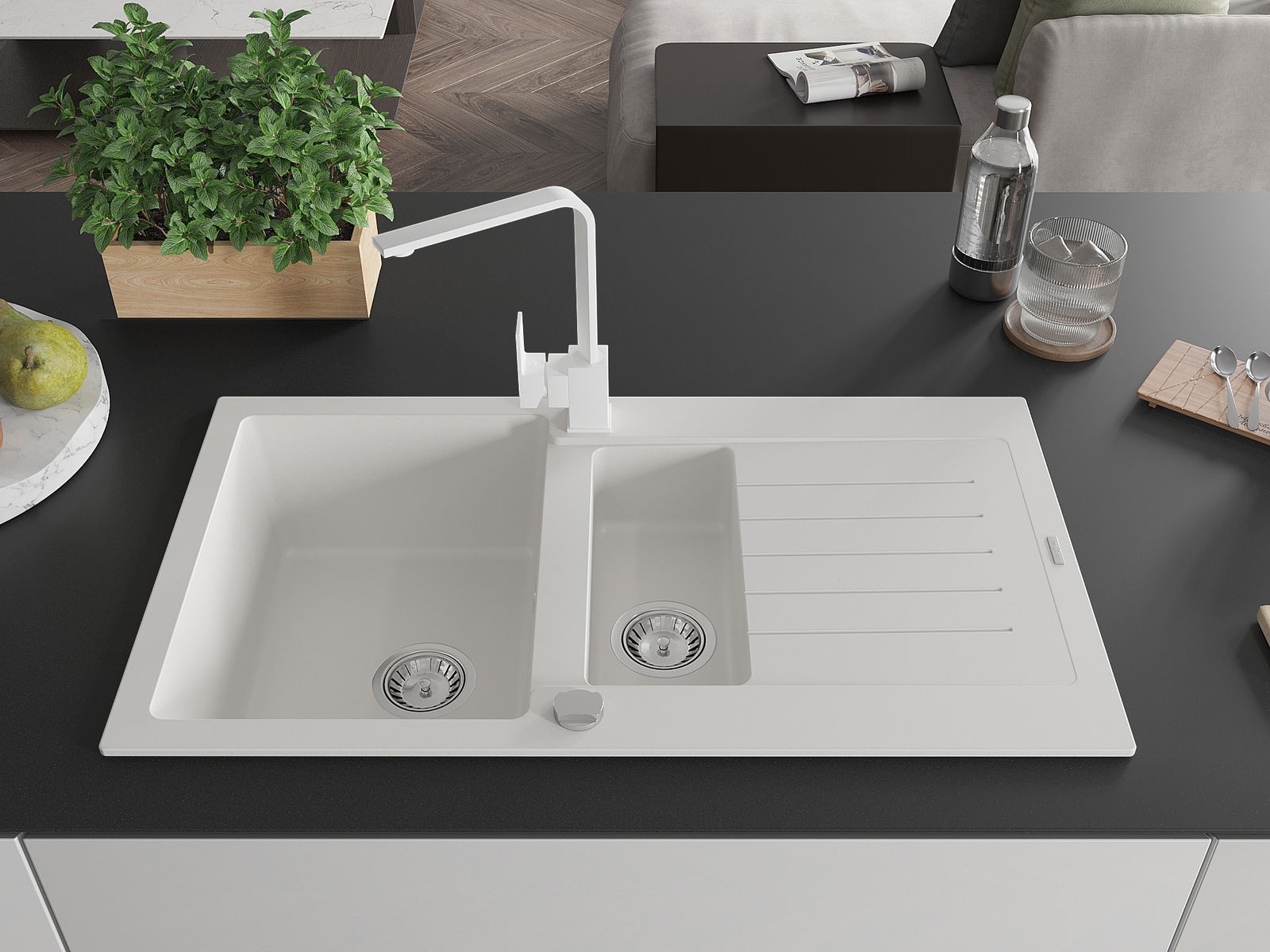 Mexen Matias chiuvetă de granit 1,5 compartimentă cu scurgător și baterie de bucătărie Rita, alb - 6502-20-670300-20