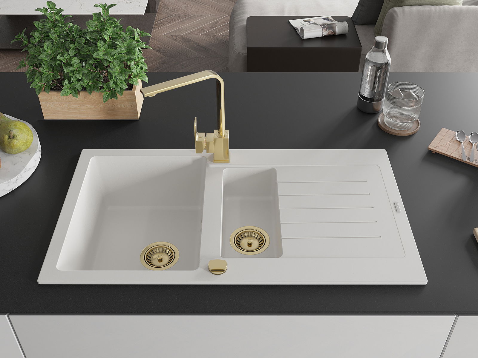 Chiuveta are 2 găuri legate cu un diametru de 35 mm, pentru auto -burst. Pot fi folosite, printre altele Pentru montarea unui distribuitor de lichid care va elimina prezența sticlelor de plastic în bucătărie și îi va oferi un finisaj elegant.