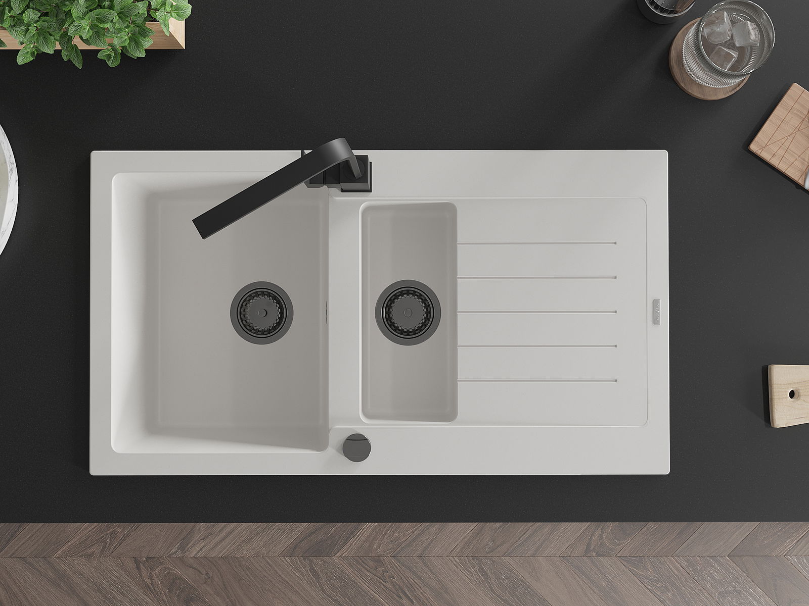 Mexen Matias chiuvetă de granit 1,5 compartimente cu picurător și baterie de bucătărie Rita, alb - 6502-20-670300-70