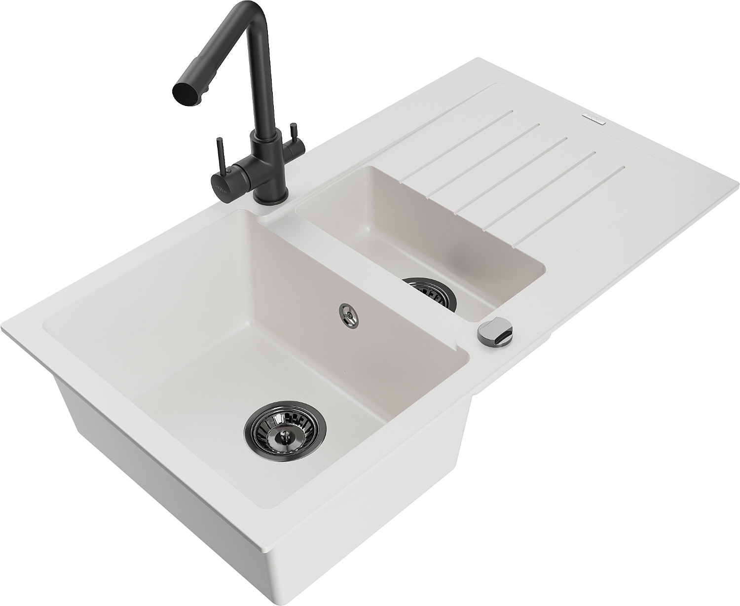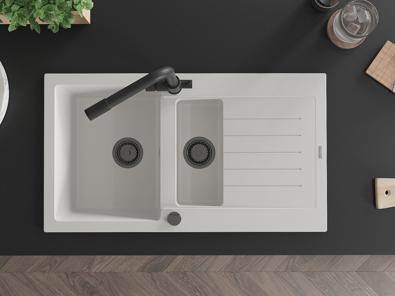 Mexen Matias chiuvetă de granit cu 1,5 compartimente cu scurgător și baterie de bucătărie Duero, alb - 6502-20-671600-70