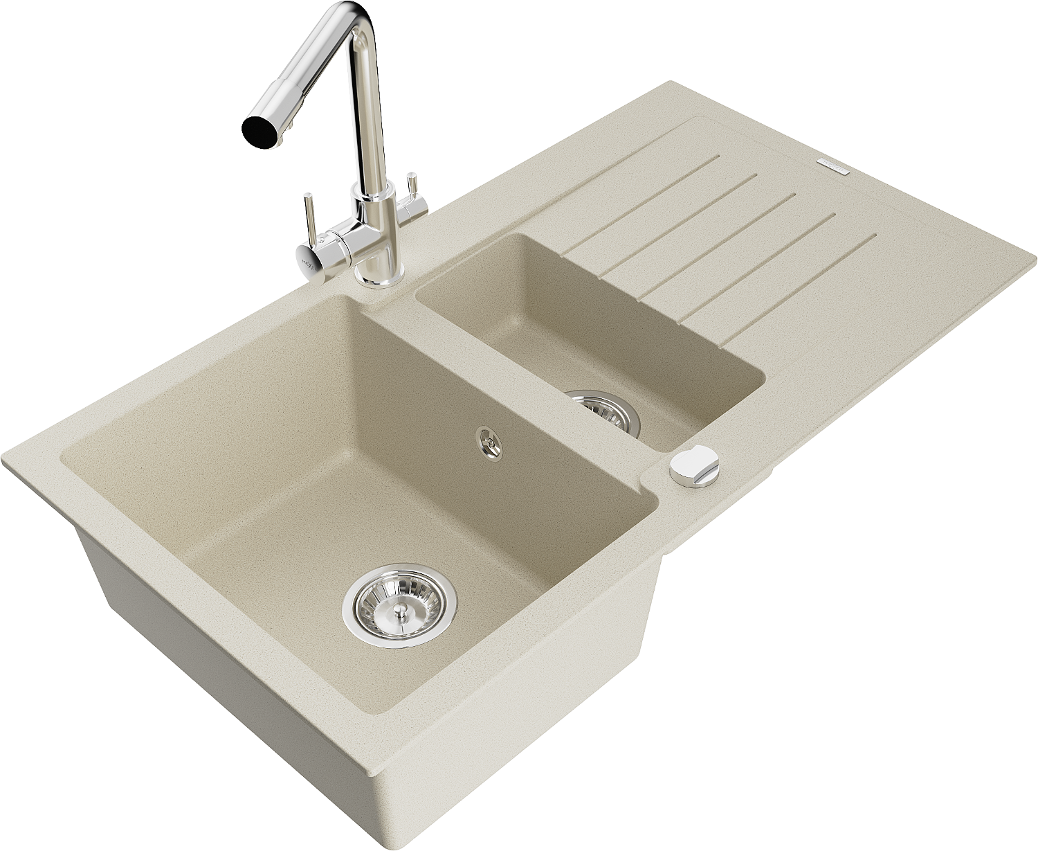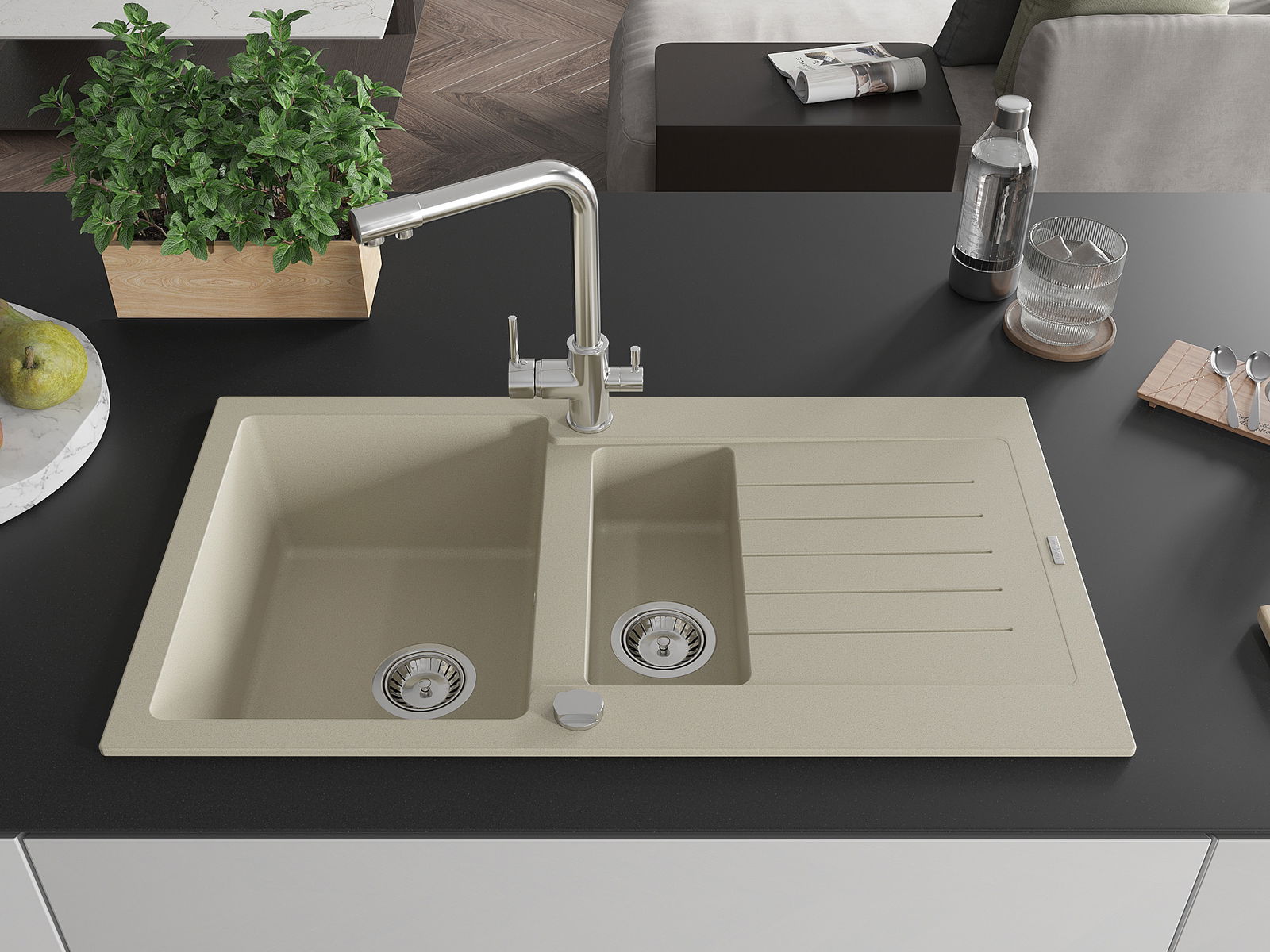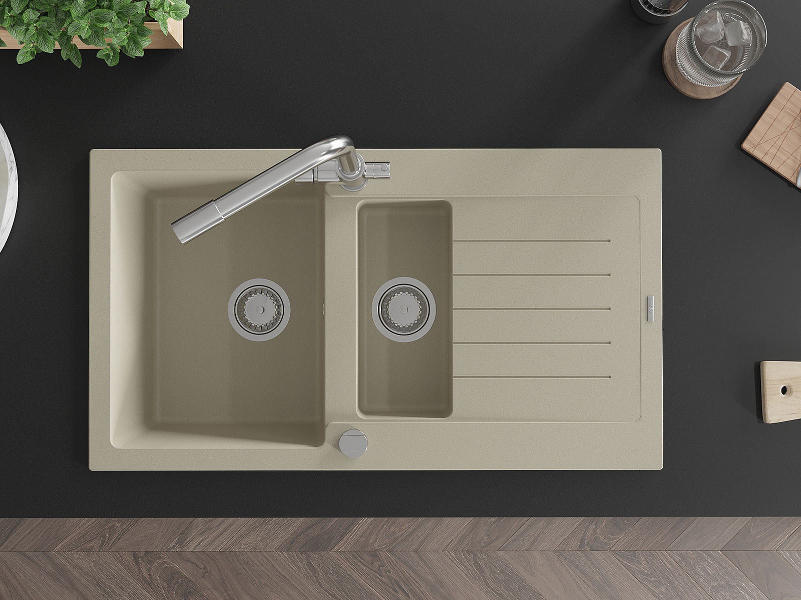 Mexen Matias chiuvetă de granit 1,5 compartimente cu scurgător și baterie de bucătărie Duero, bej - 6502-69-671600-00