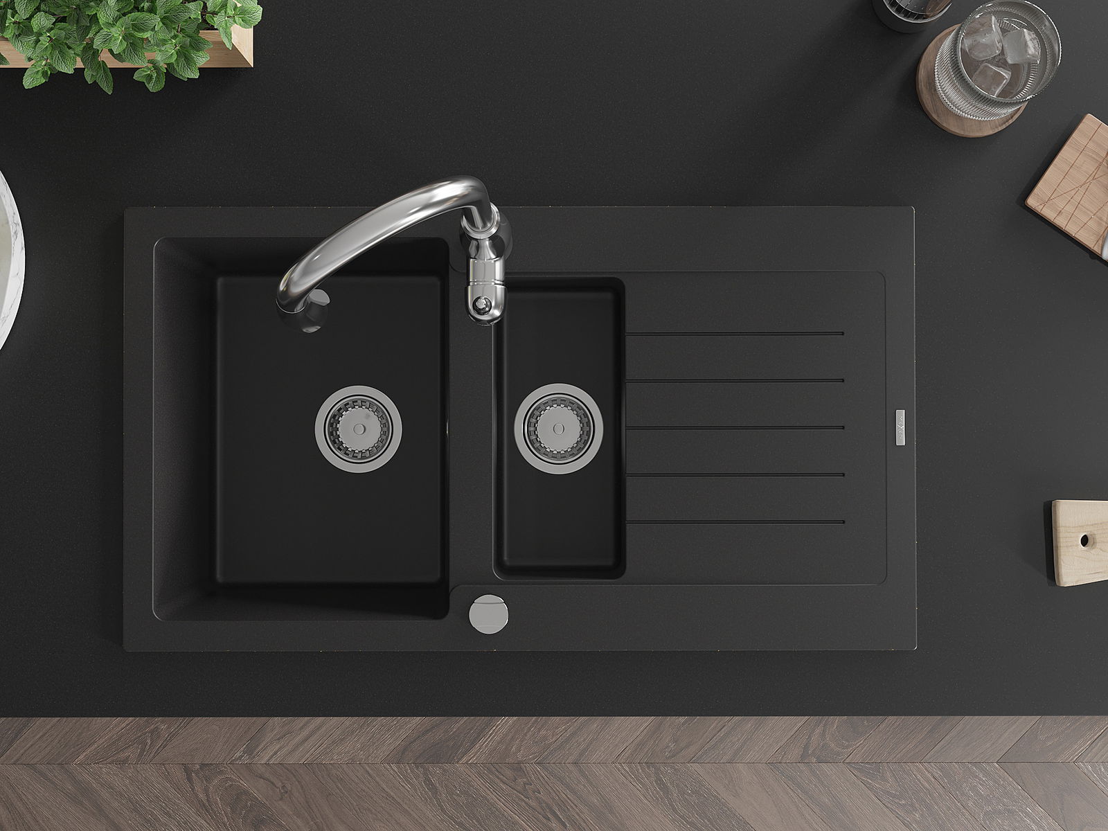 Datorită sistemului de montare universală, chiuveta este reversibilă, iar scurgerea poate fi montată pe blat la stânga sau la dreapta. În acest fel, puteți ajusta cu ușurință pagina la nevoile și condițiile dvs.
