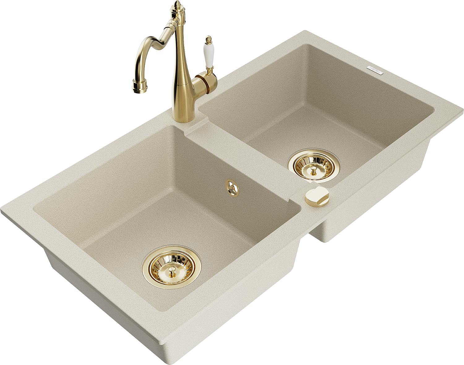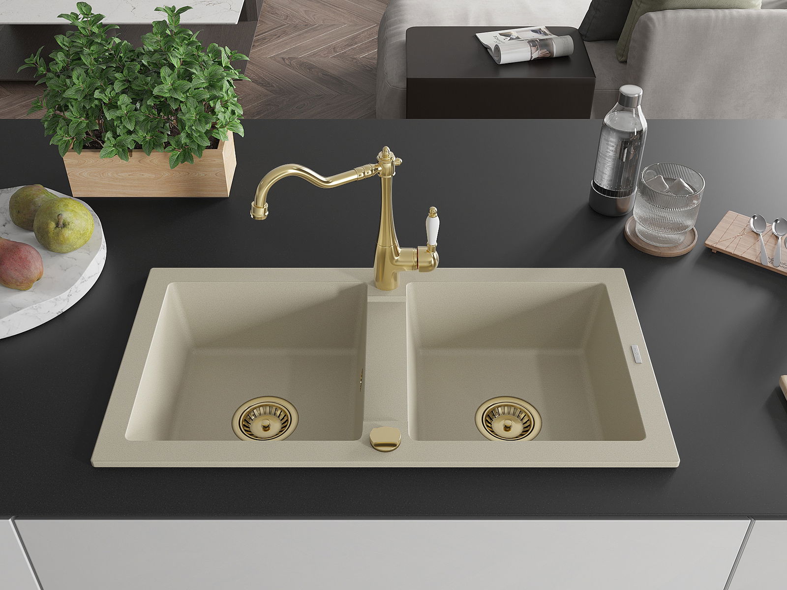 Mexen Mario chiuvetă din granit cu 2 compartimente și baterie de bucătărie Carla, bej - 6504-69-670700-50