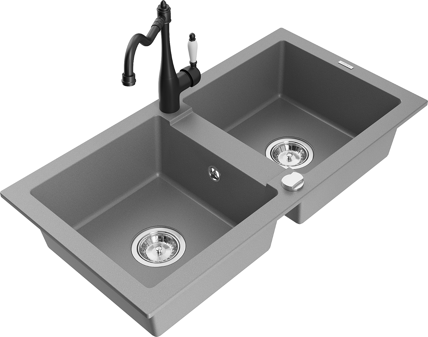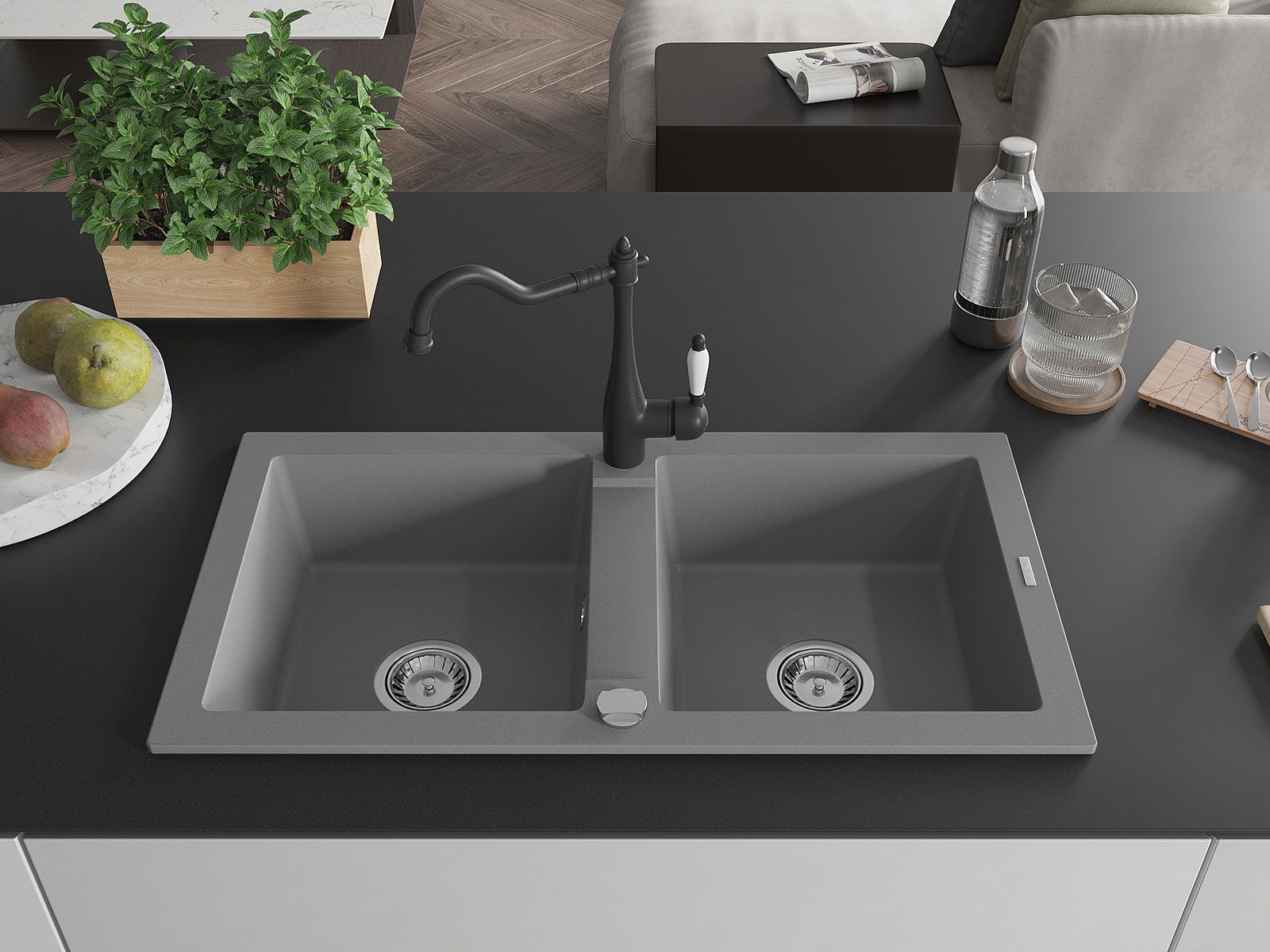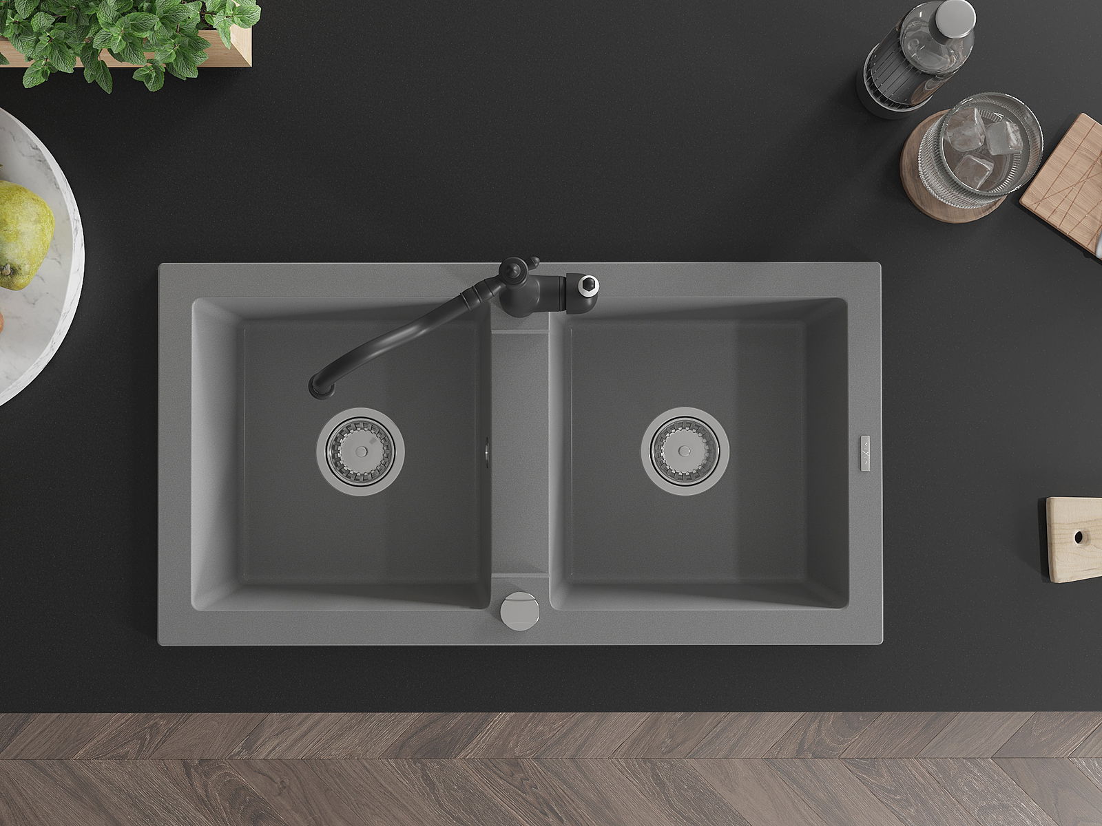 Mexen Mario chiuvetă de bucătărie din granit cu 2 compartimente și baterie de bucătărie Carla, gri - 6504-71-670700-70