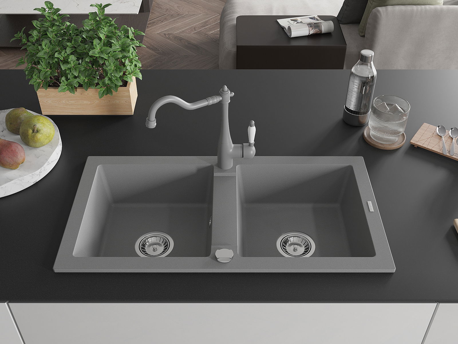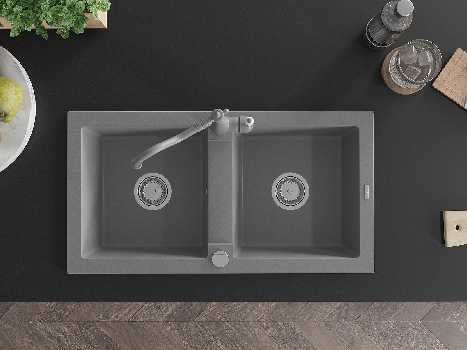 Mexen Mario chiuvetă din granit cu 2 compartimente și baterie de bucătărie Carla, gri - 6504-71-670700-71