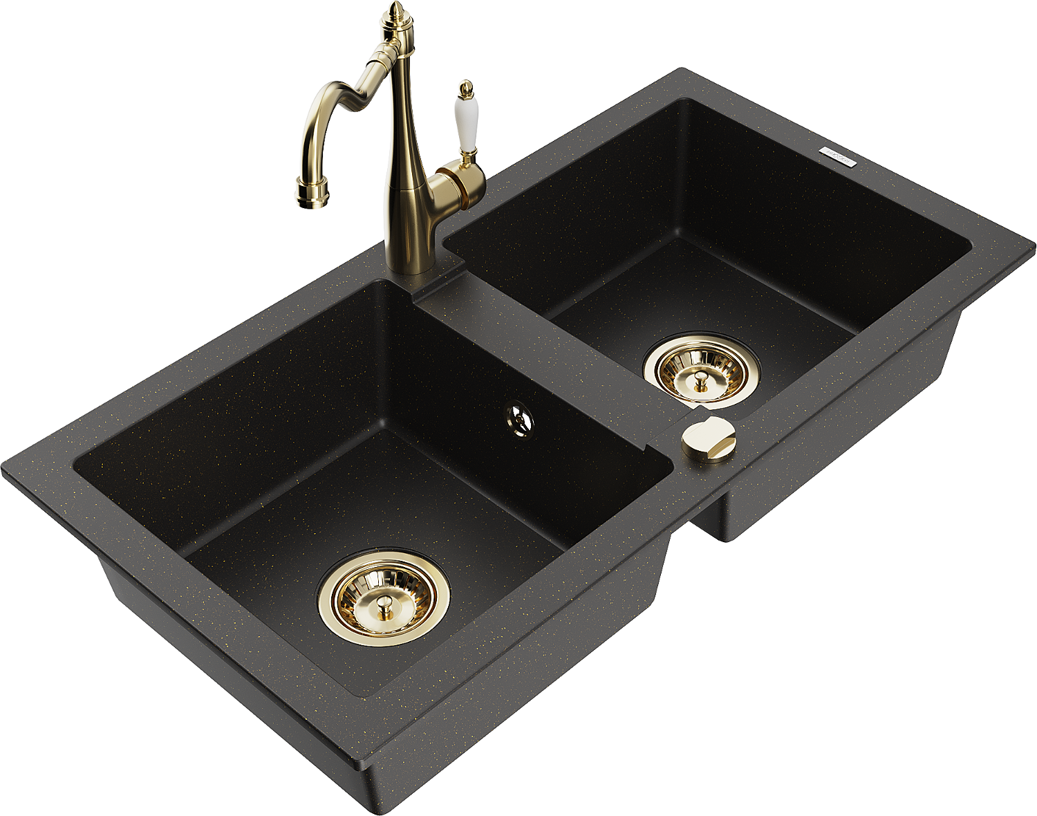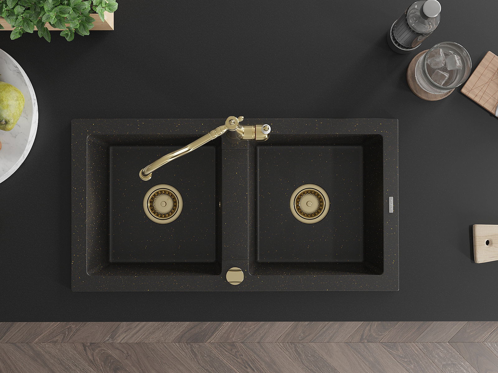 Mexen Mario chiuvetă de granit cu 2 compartimente și baterie de bucătărie Carla, negru/auriu metalizat - 6504-75-670700-50