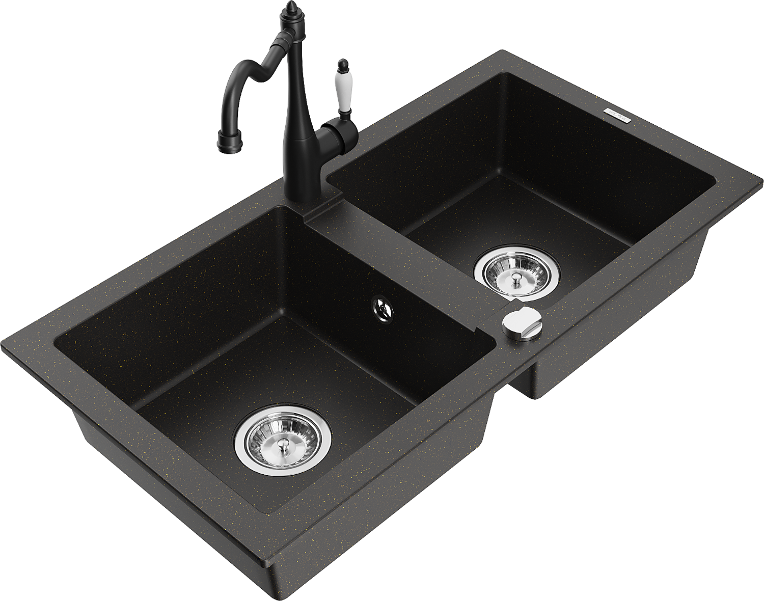 Mexen Mario chiuvetă de granit cu 2 compartimente și baterie de bucătărie Carla, metalic negru/auriu - 6504-75-670700-70