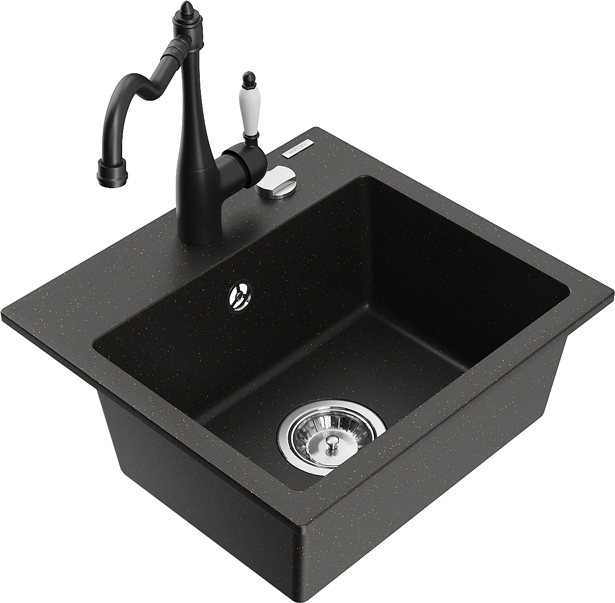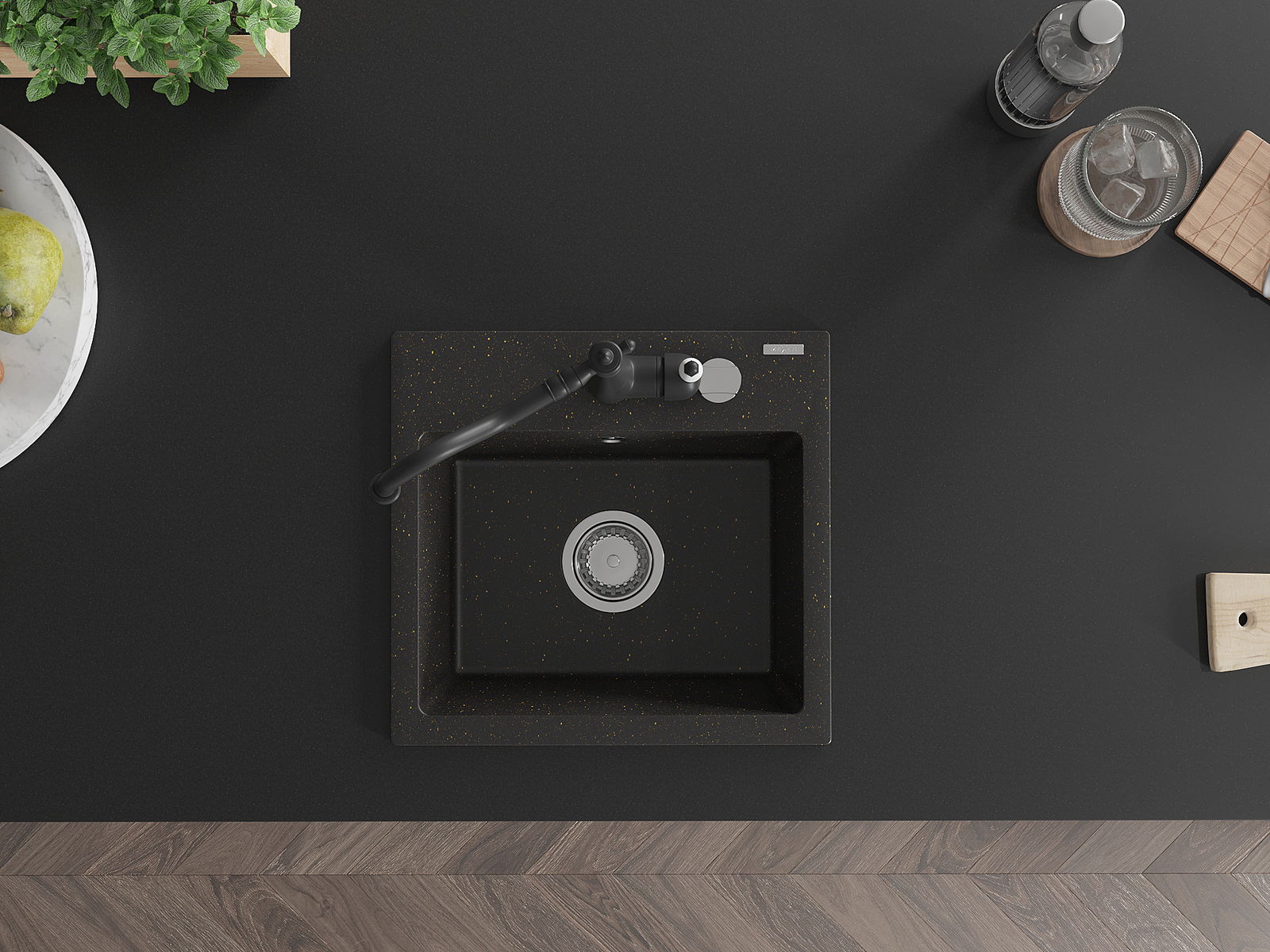 Mexen Milo chiuvetă de bucătărie din granit cu 1 compartiment și baterie de bucătărie Carla, negru/auriu metalic - 6505-75-6707?