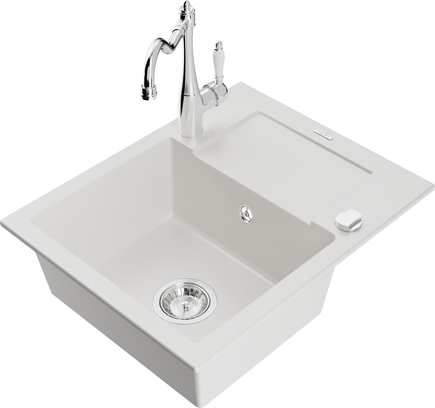 Mexen Enzo chiuvetă granitică cu 1 compartiment cu scurgător și baterie de bucătărie Carla, alb - 6506-20-670700-00