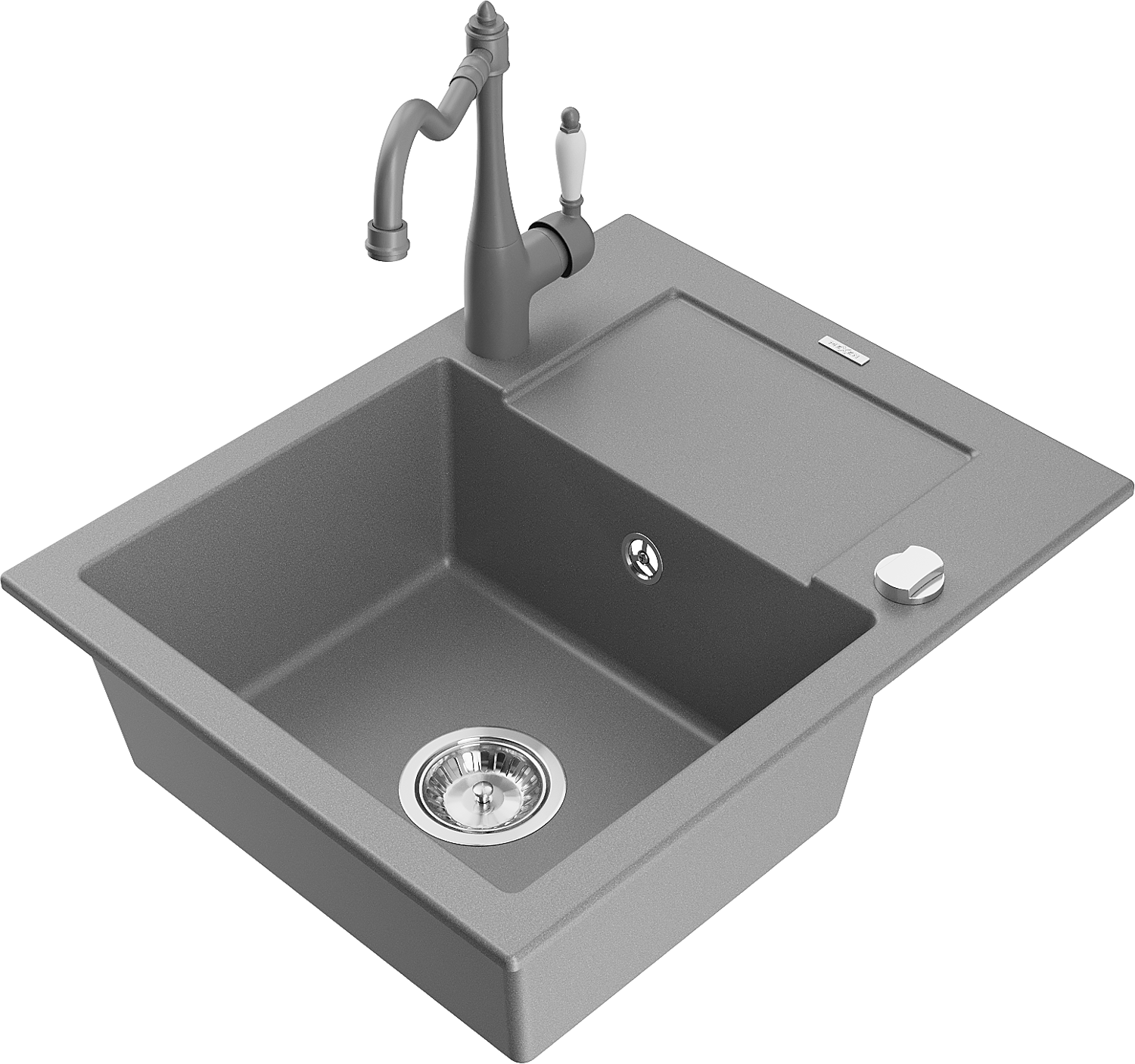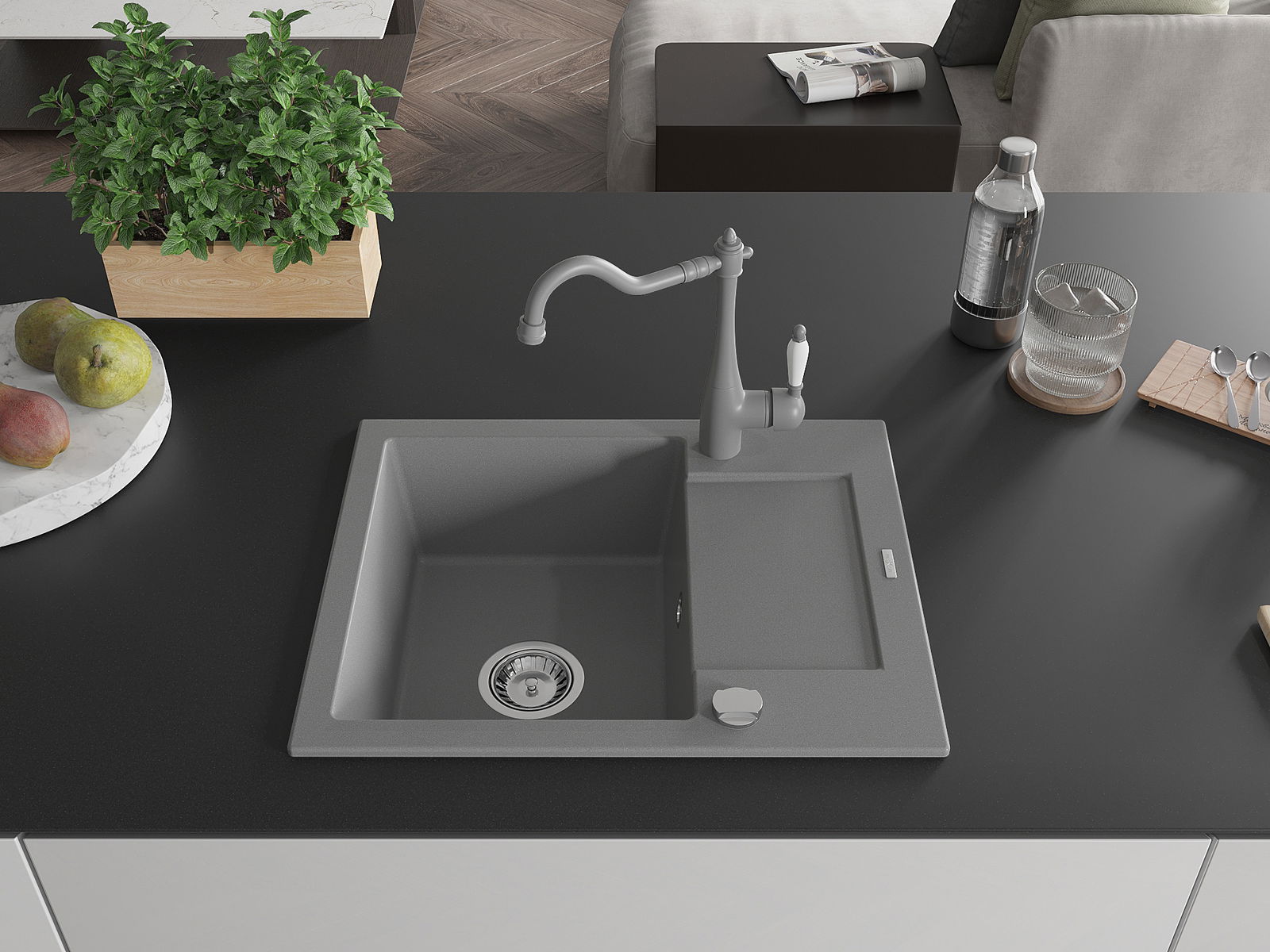 Mexen Enzo chiuvetă de bucătărie din granit cu 1 compartiment cu scurgător și baterie de bucătărie Carla, gri - 6506-71-670700-?