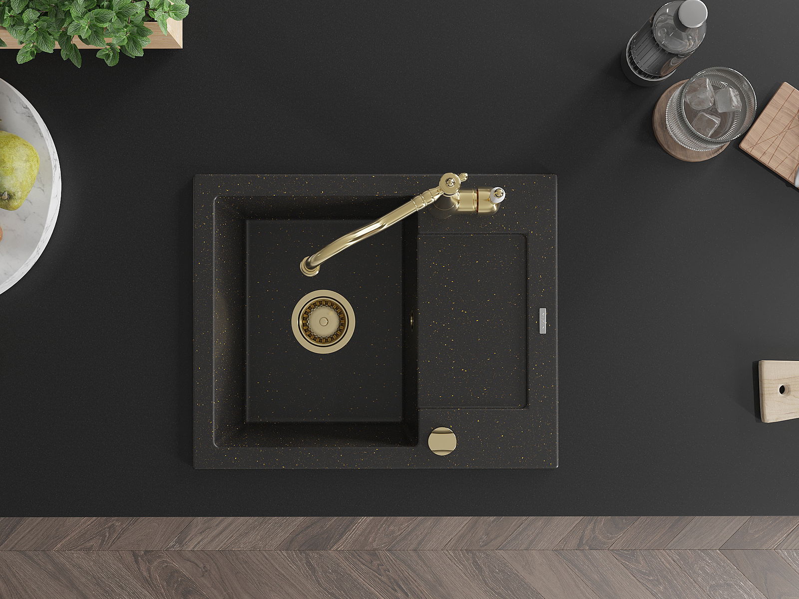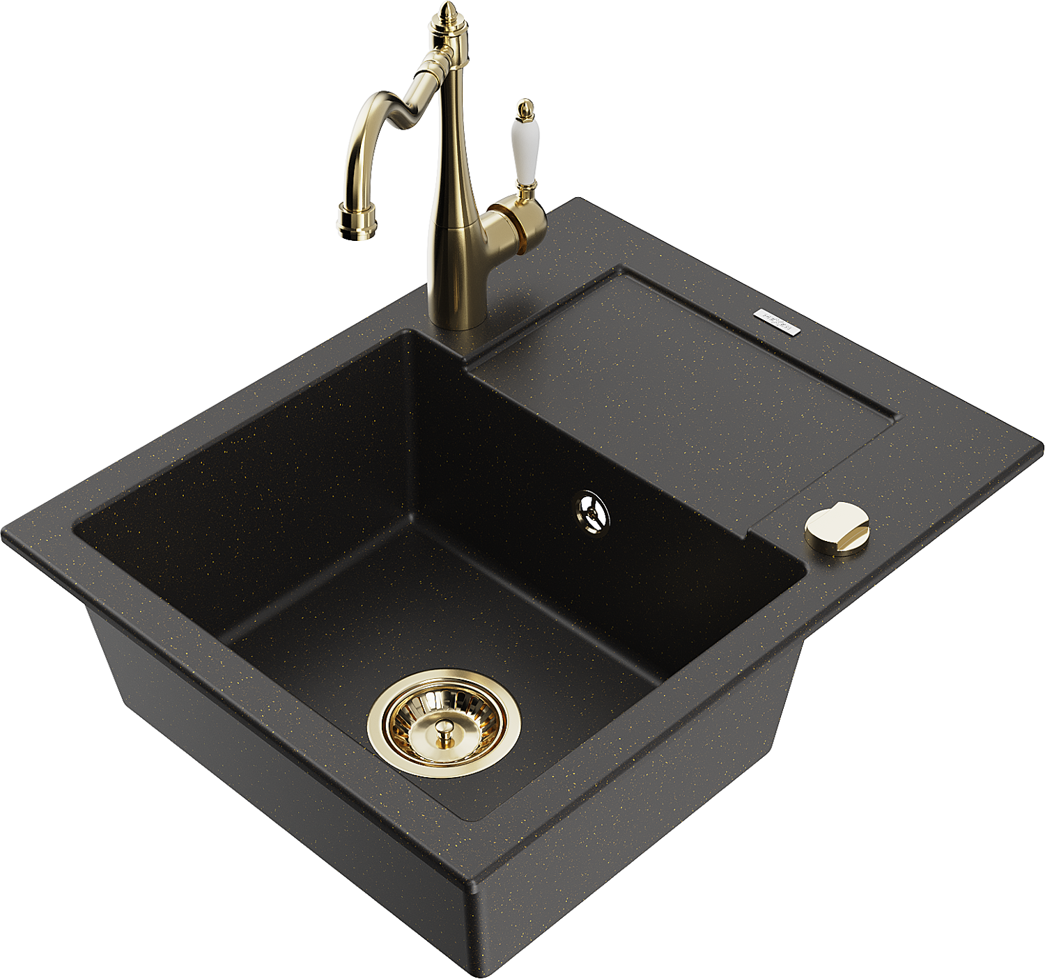 Mexen Enzo chiuvetă de granit cu 1 compartiment cu scurgător și baterie de bucătărie Carla, negru/auriu metalic