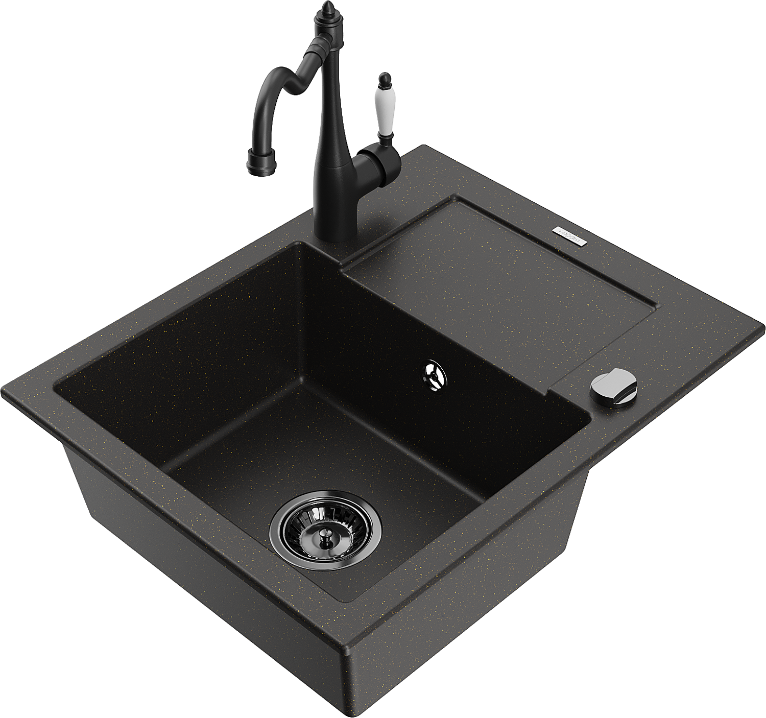 Mexen Enzo chiuvetă din granit cu 1 compartiment cu scurgător și baterie de bucătărie Carla, negru/auriu metalic