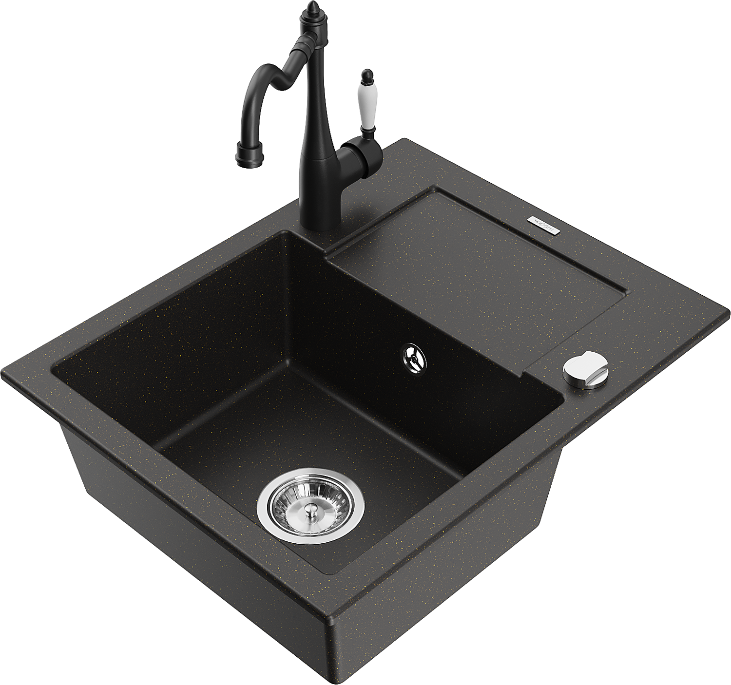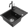 Mexen Enzo chiuvetă din granit cu 1 compartiment și scurgător, cu baterie de bucătărie Carla, negru/auriu metalic
