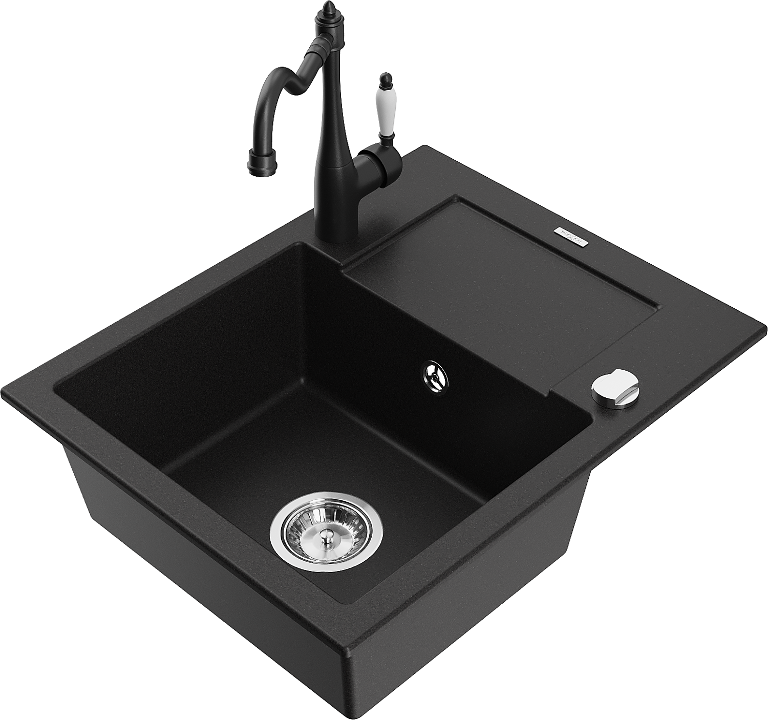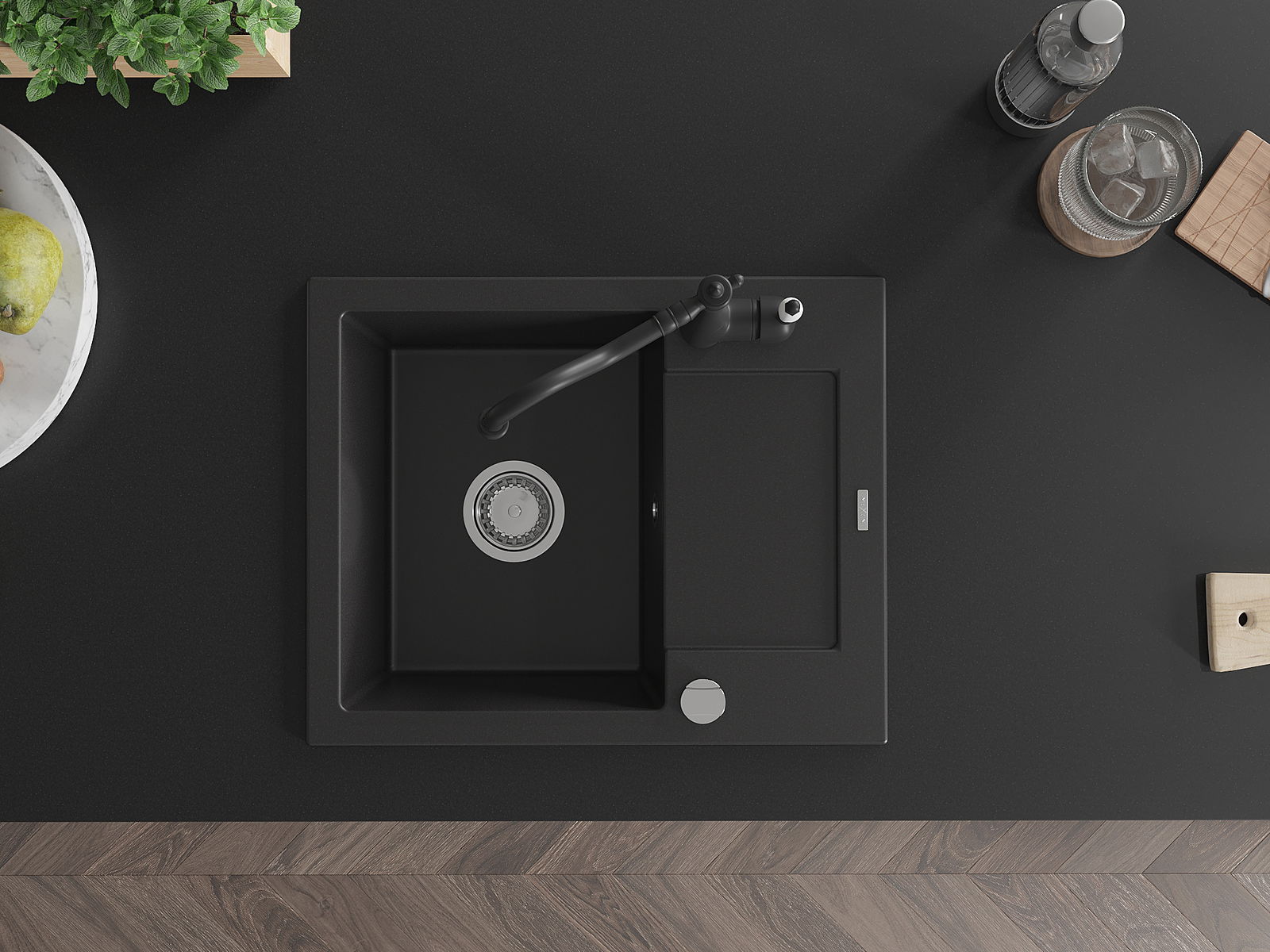 Mexen Enzo chiuvetă de granit cu 1 compartiment, cu scurgător și baterie de bucătărie Carla, negru - 6506-77-670700-70