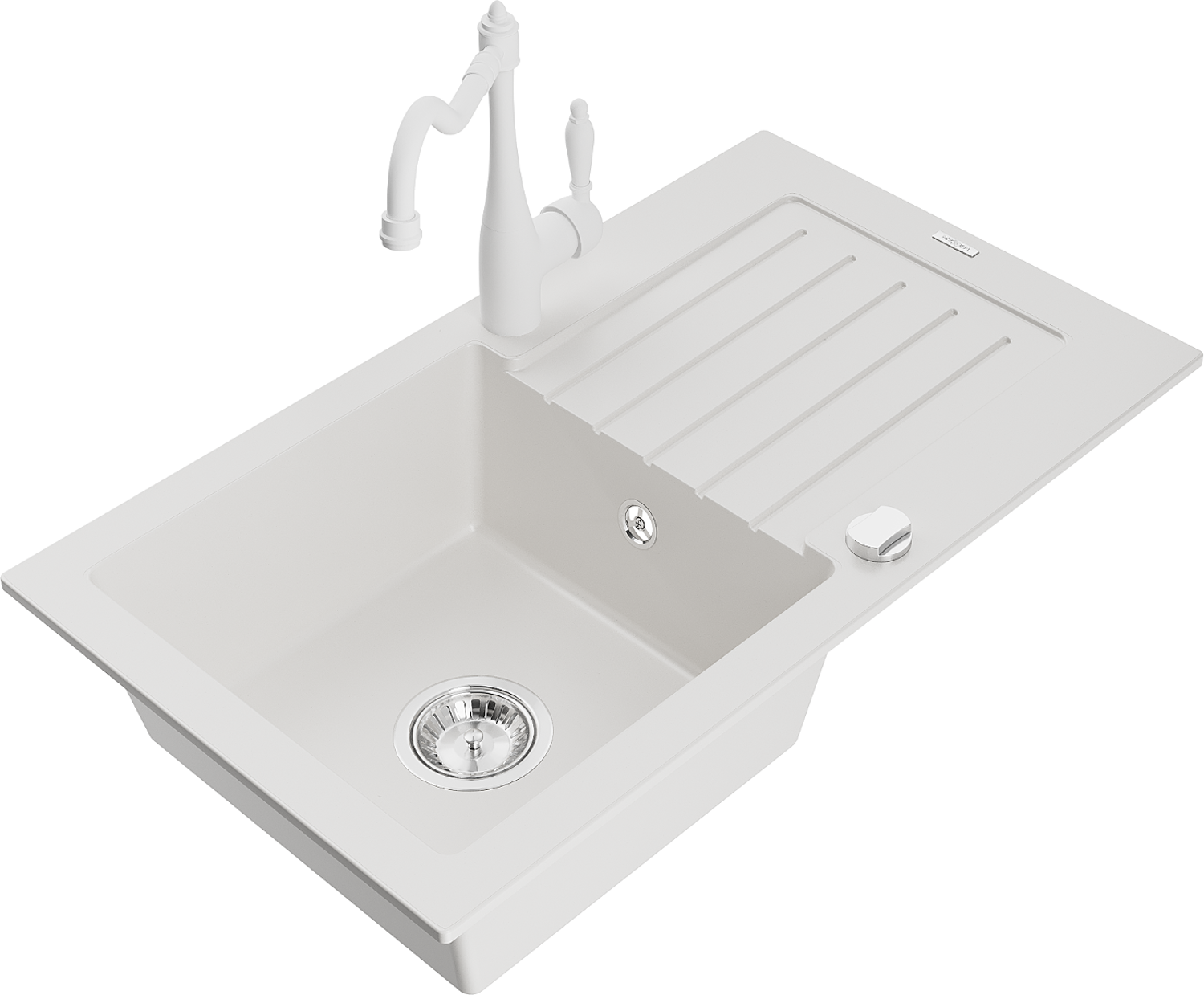 Mexen Pablo chiuvetă granit 1 cuvă cu scurgător și baterie de bucătărie Carla, alb - 6510-20-670700-20