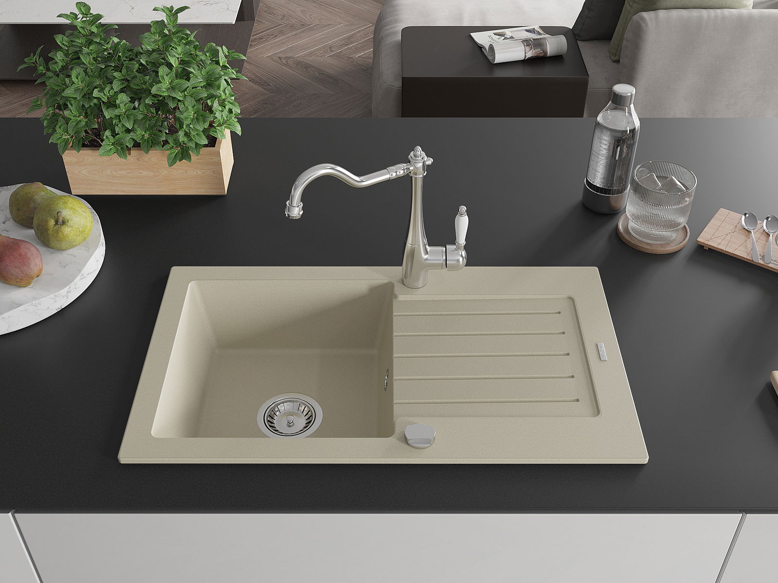 Suprafața chiuvetei este rezistentă la pete și decolorare, ceea ce o face ușor de întreținut și își păstrează culoarea pentru o perioadă lungă de utilizare. Un complet estetic și practic pentru orice bucătărie.