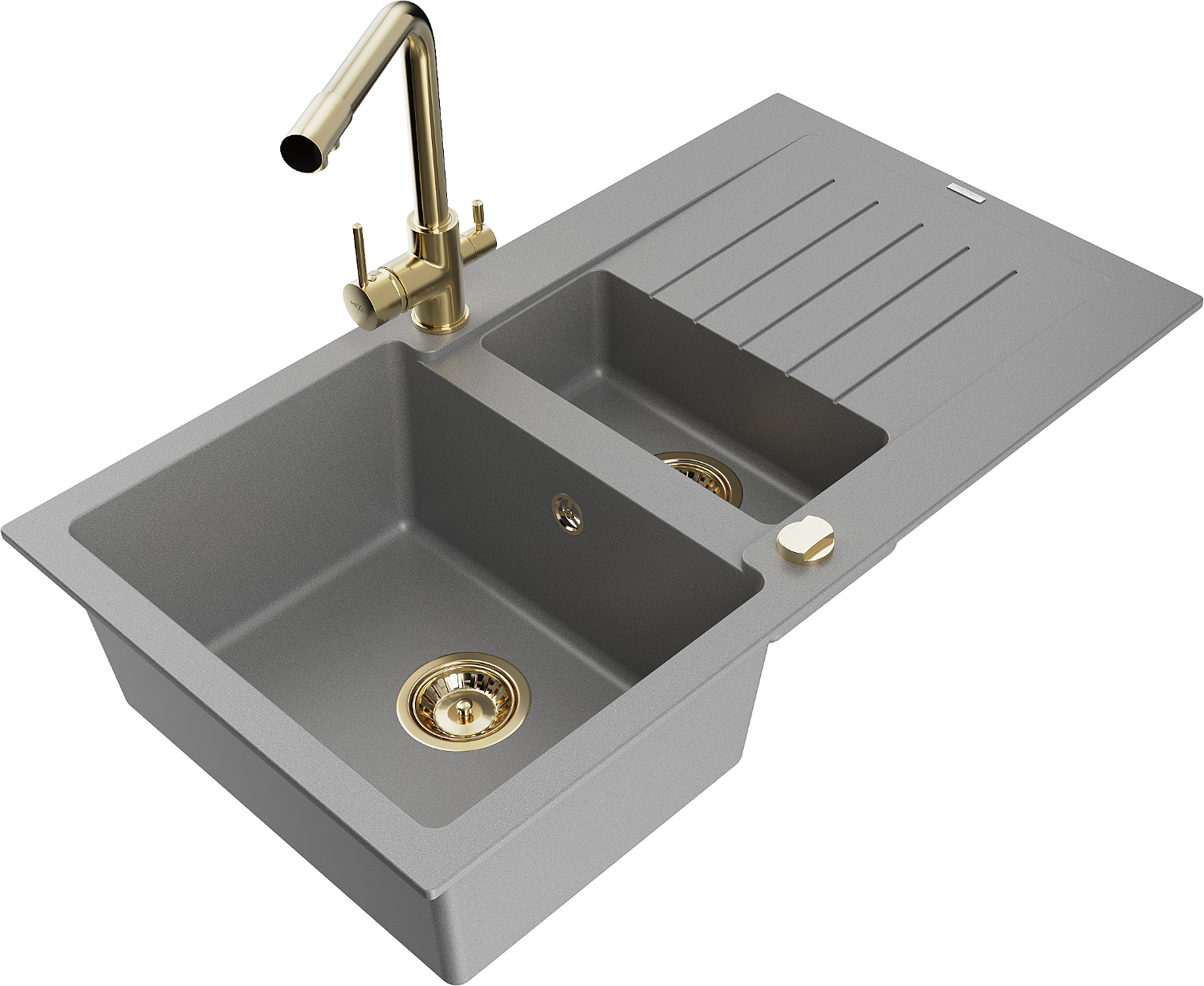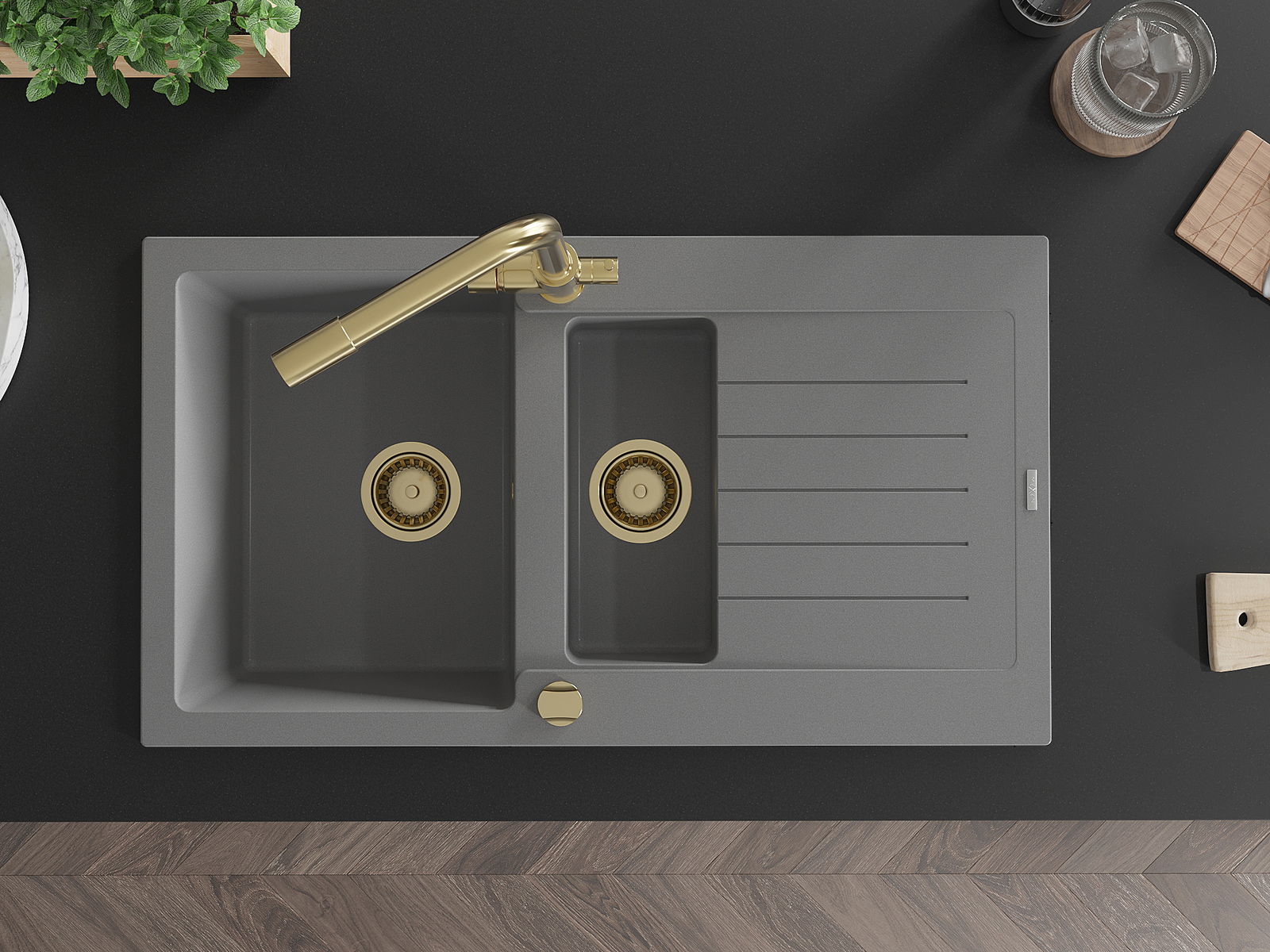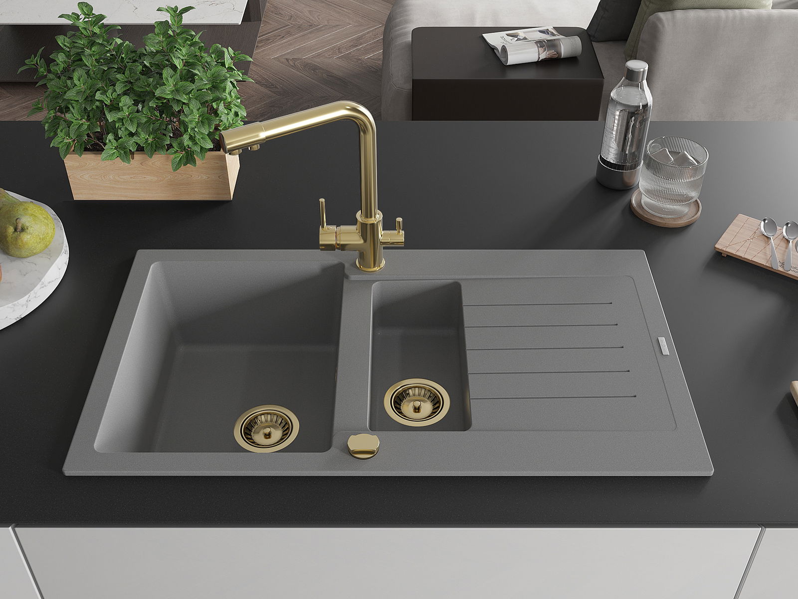 Mexen Matias chiuvetă de granit cu 1,5 cuve cu scurgător și baterie de bucătărie Duero, gri - 6502-71-671600-50