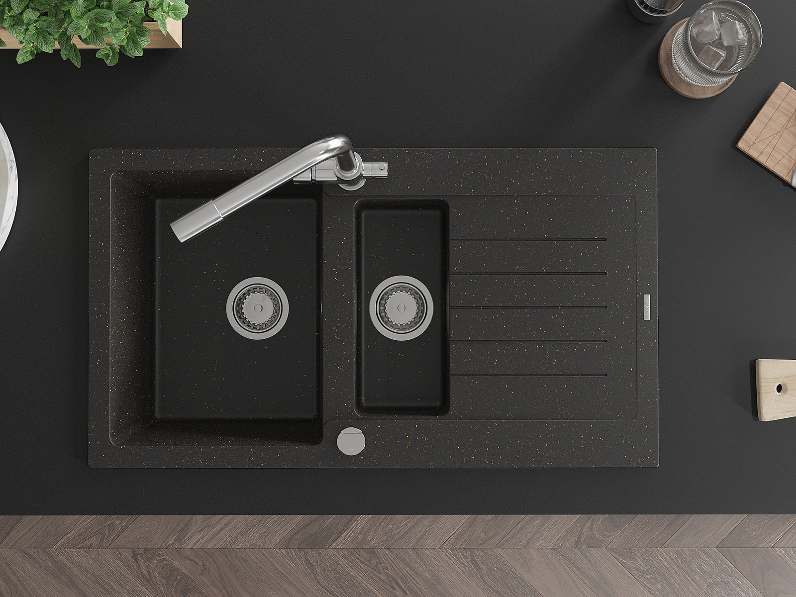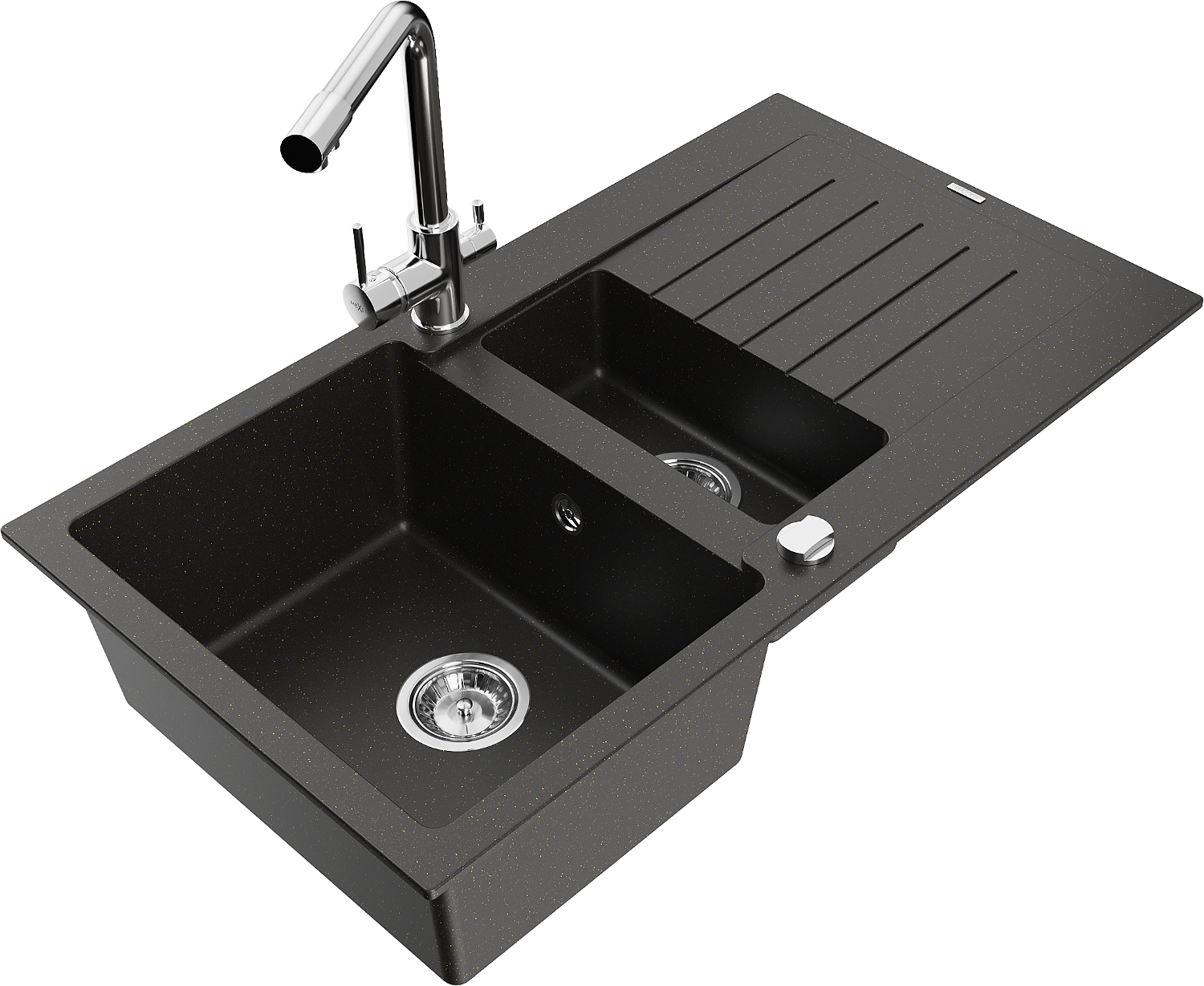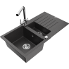 Mexen Matias chiuvetă de granit cu 1,5 cuve, cu scurgător și baterie de bucătărie Duero, negru/auriu metalic