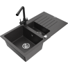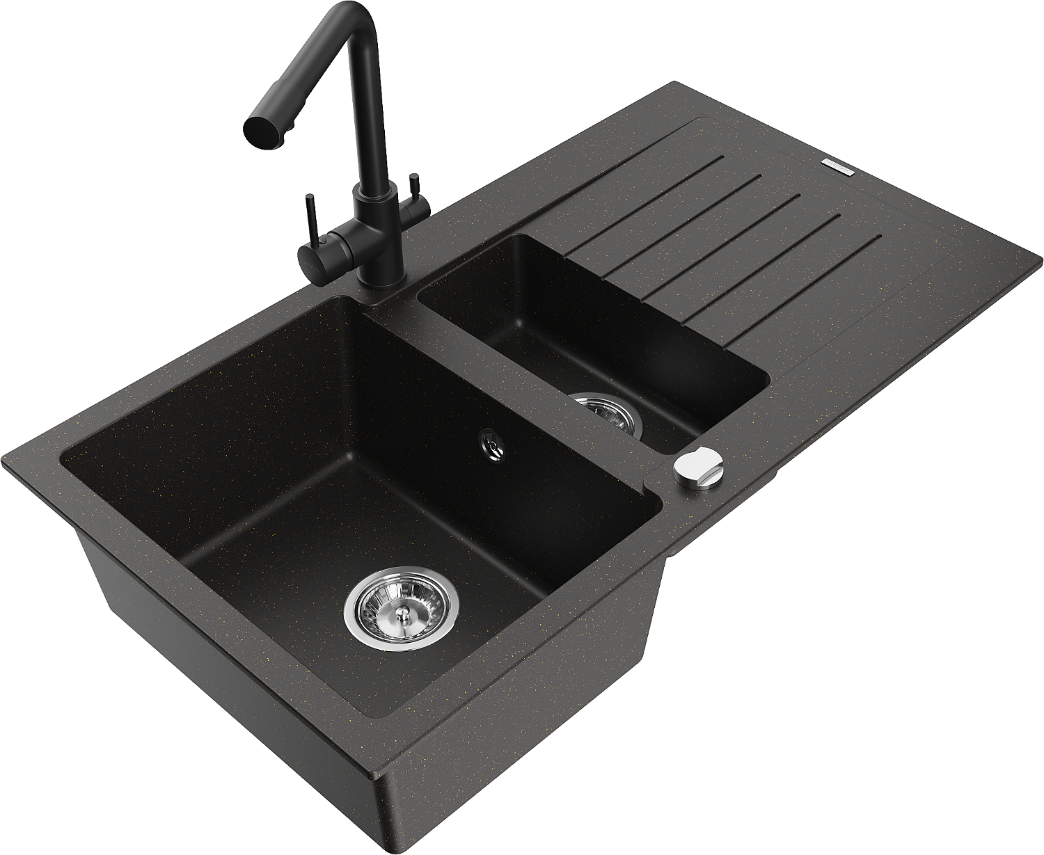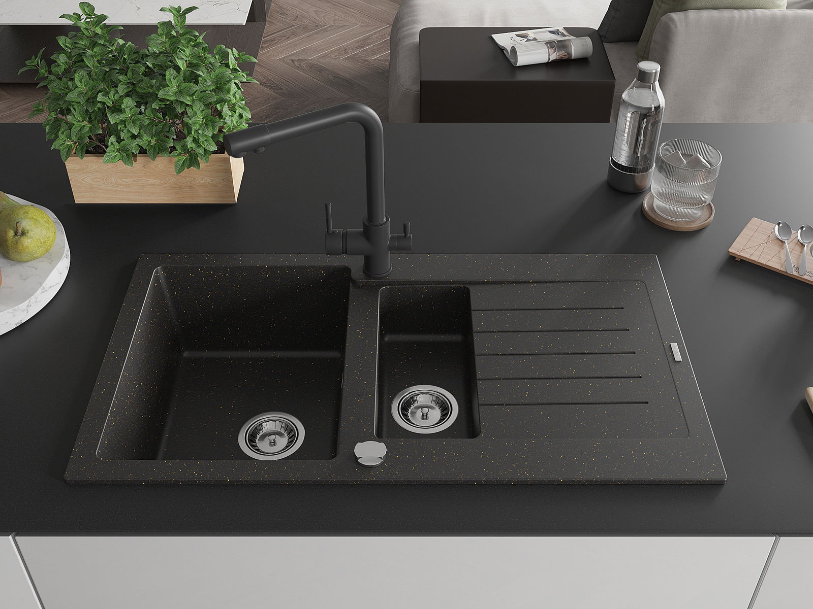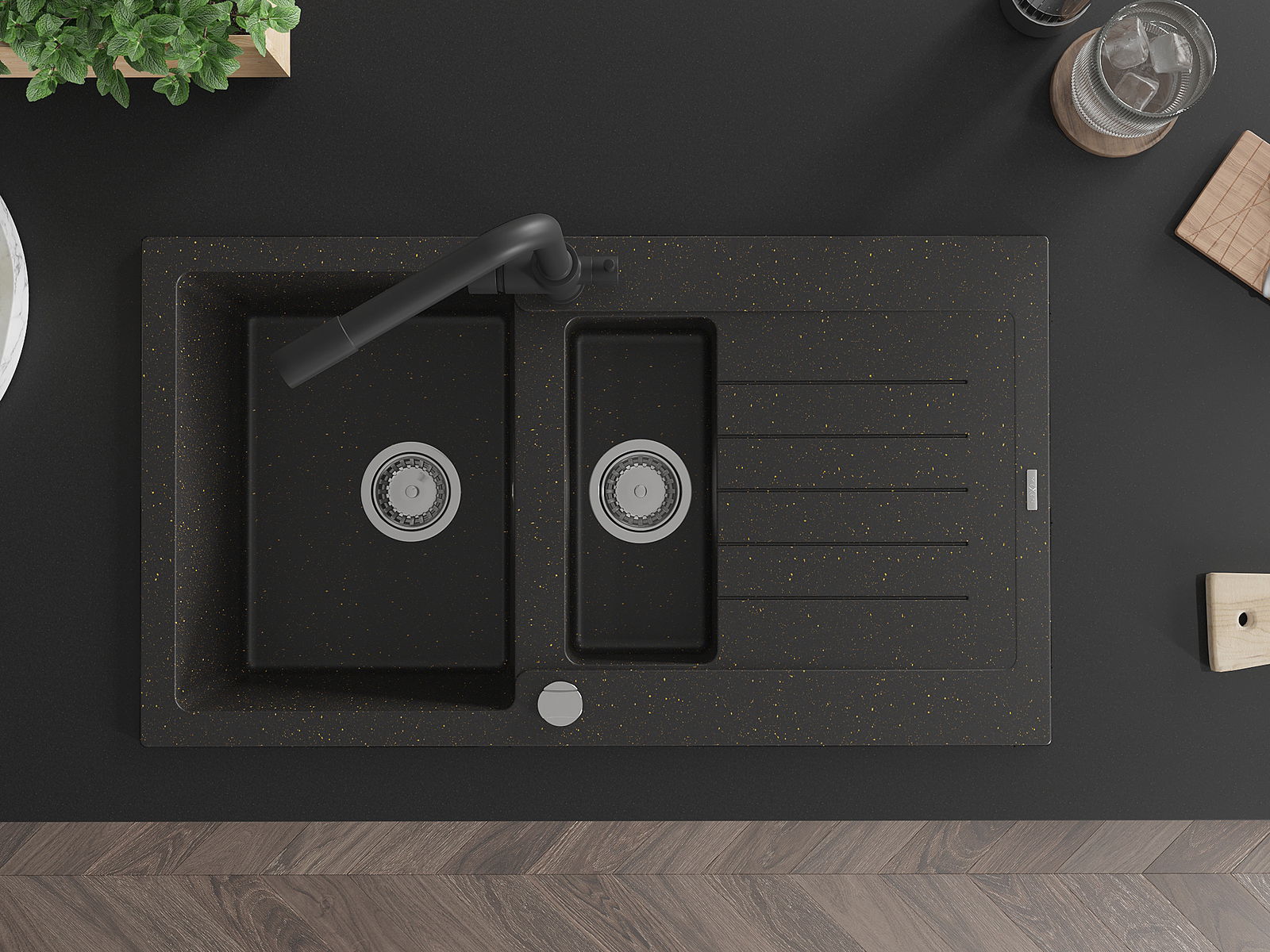 Mexen Matias chiuvetă din granit cu 1,5 compartimente, cu scurgător și baterie de bucătărie Duero, negru/auriu metalizat