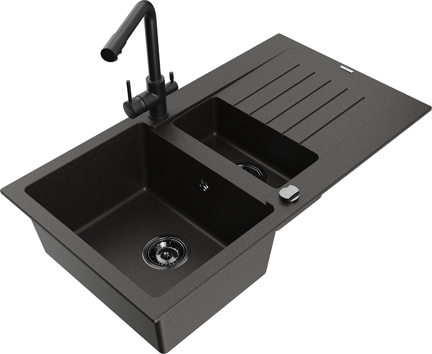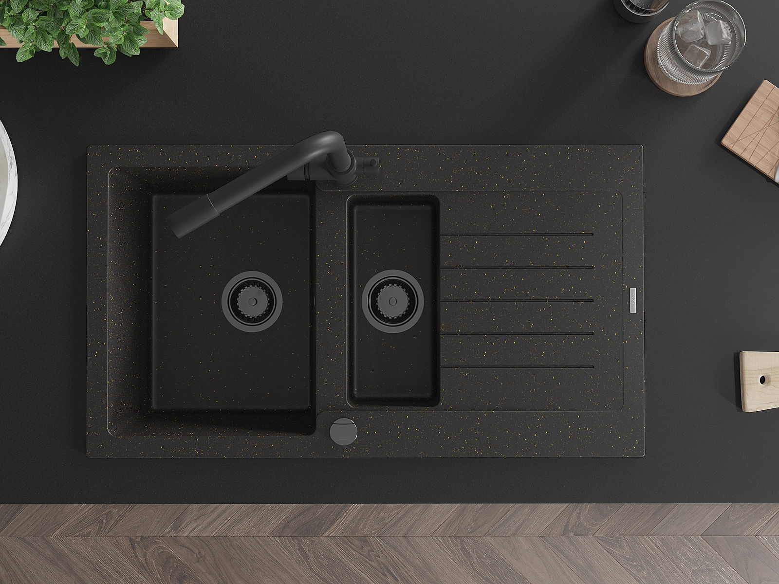 Mexen Matias chiuvetă de granit cu 1,5 compartimente și scurgător, cu baterie de bucătărie Duero, negru/auriu