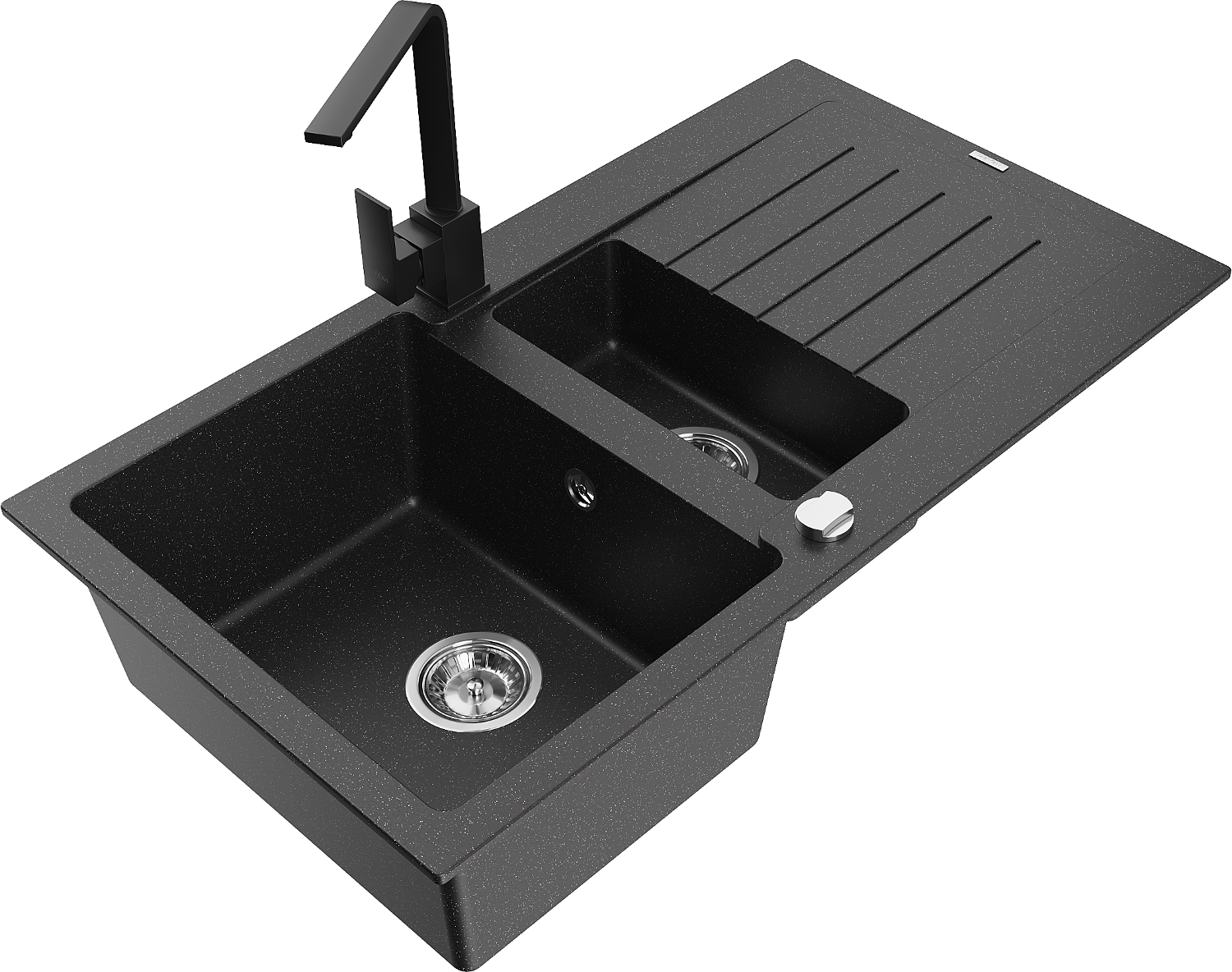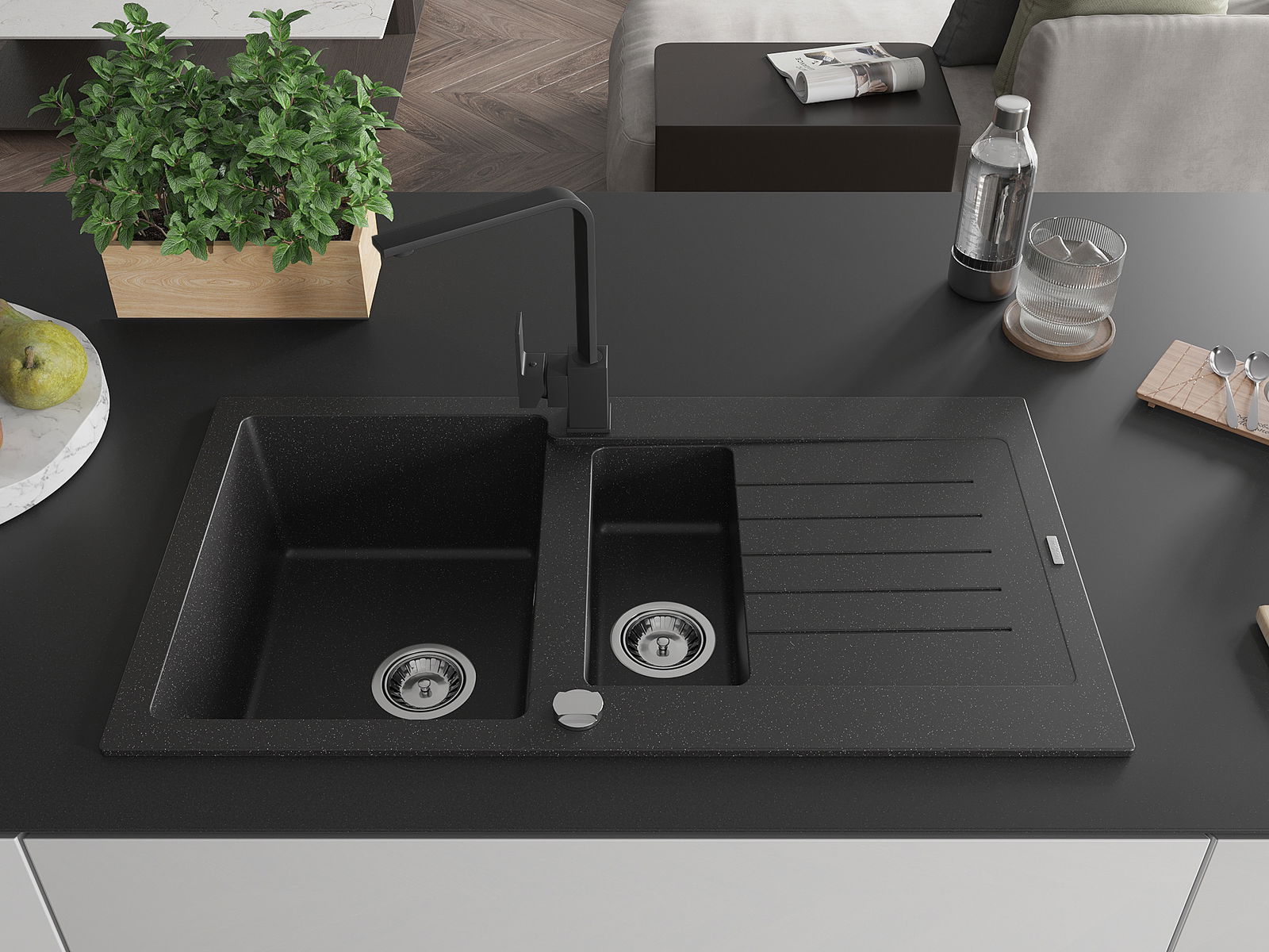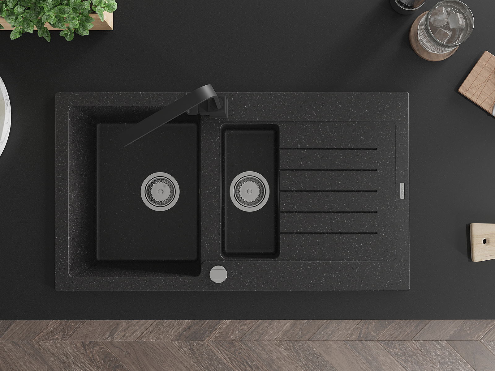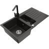 Mexen Matias chiuvetă din granit cu 1,5 compartimente cu scurgător și baterie de bucătărie Rita, negru/argintiu metalic
