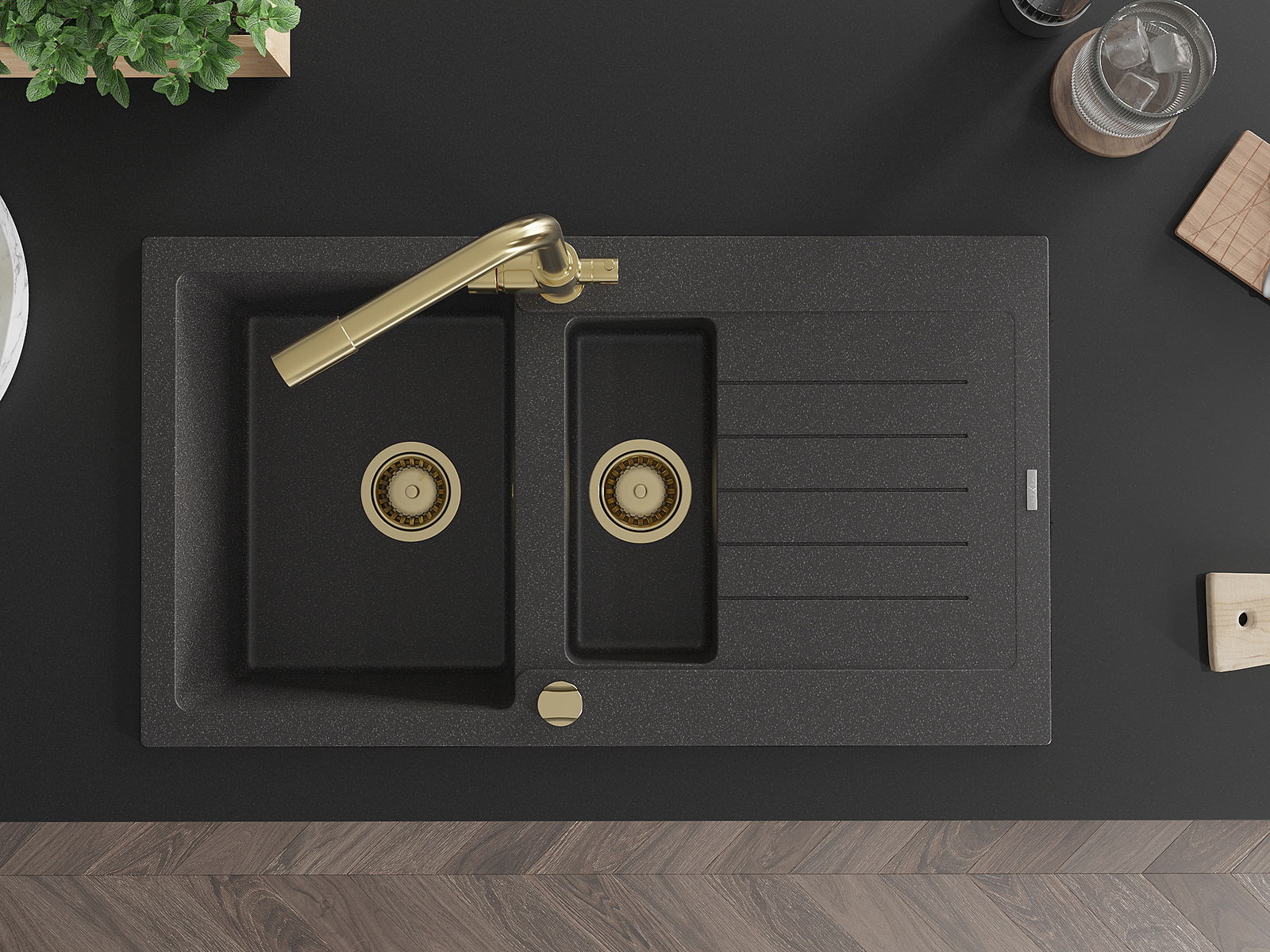 Mexen Matias chiuvetă granit 1,5 camere cu scurgător și baterie bucătărie Duero, negru cu pete - 6502-76-671600-50
