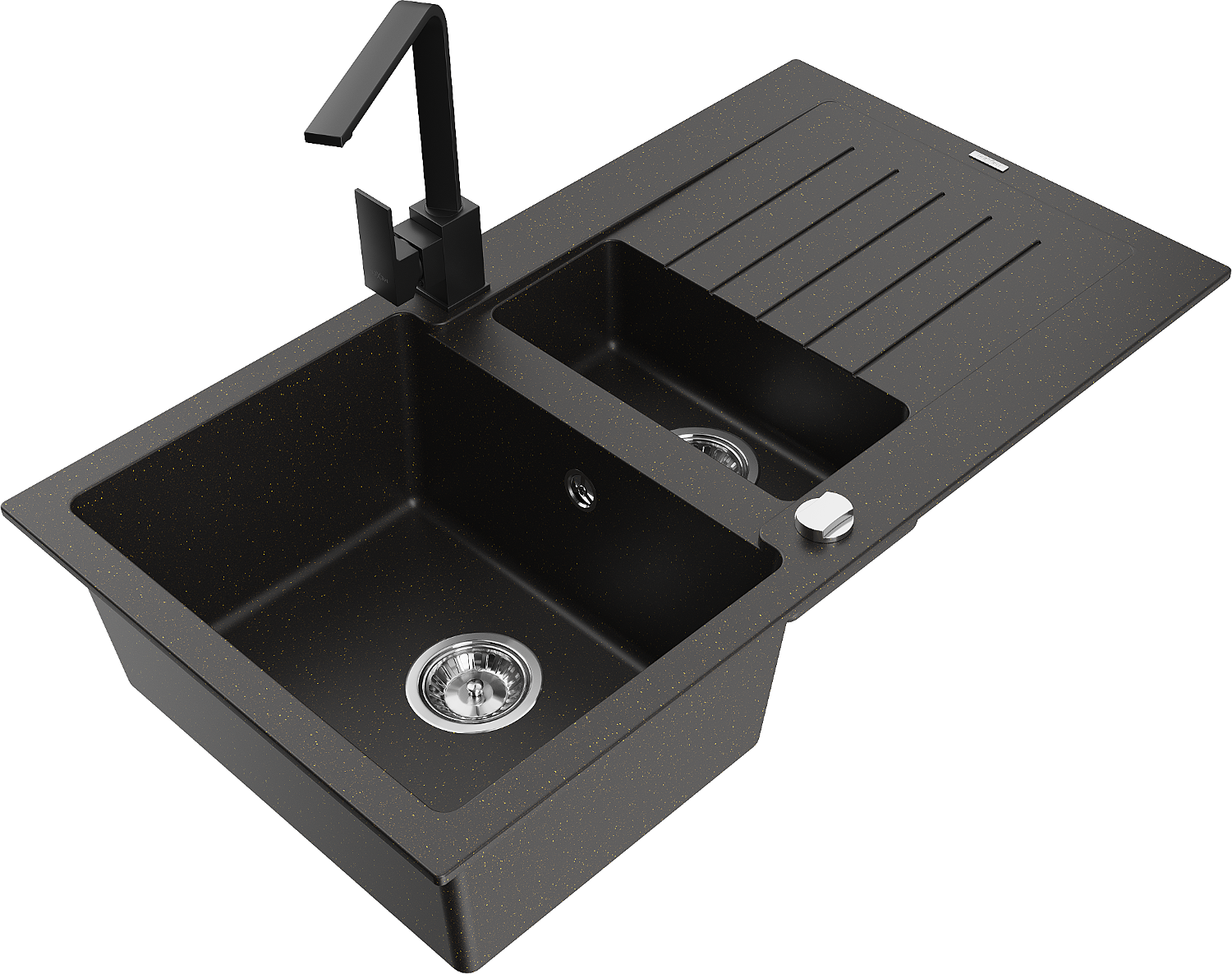 Mexen Matias chiuvetă de granit 1,5 compartimente cu scurgător și baterie de bucătărie Rita, negru/auriu - 6502-75-670300-70