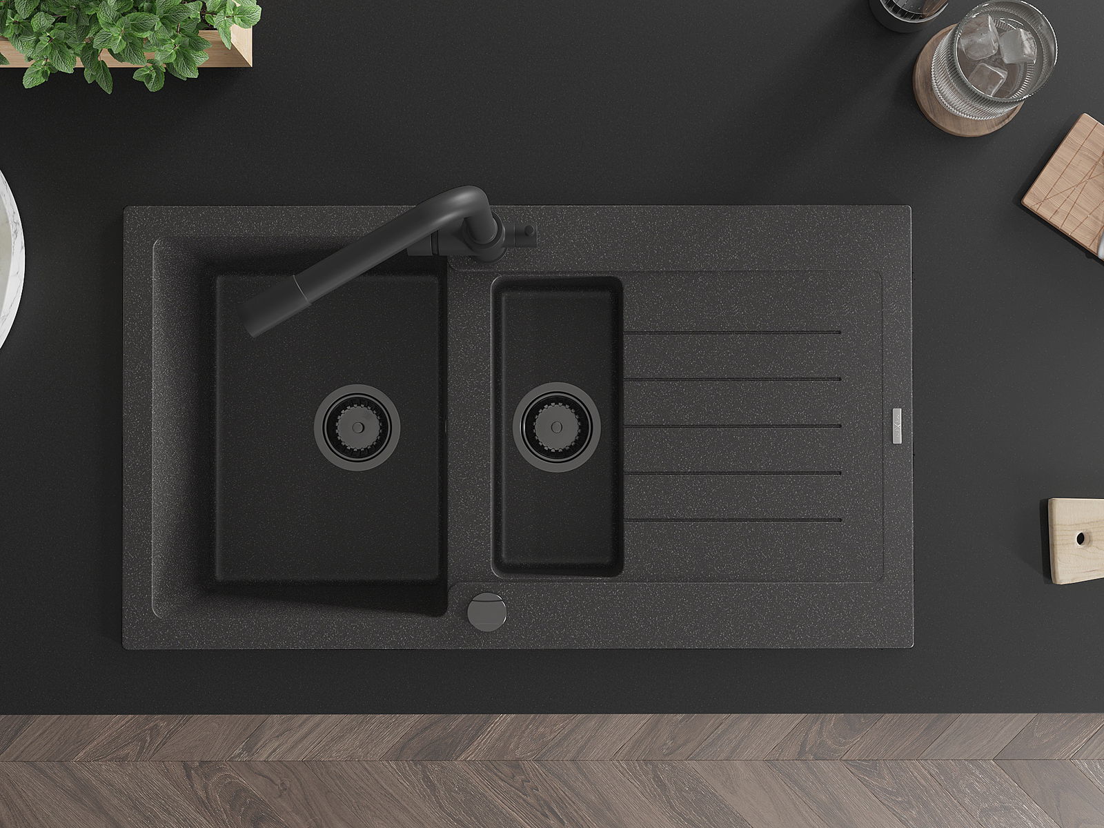 Mexen Matias chiuvetă de bucătărie din granit 1,5 compartimente cu scurgător și baterie de bucătărie Duero, negru pătat - 6502-?
