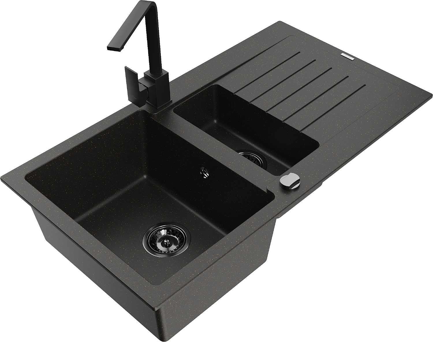 Mexen Matias chiuvetă din granit cu 1,5 camere cu scurgător și robinet de bucătărie Rita, negru/auriu - 6502-75-670300-70-B