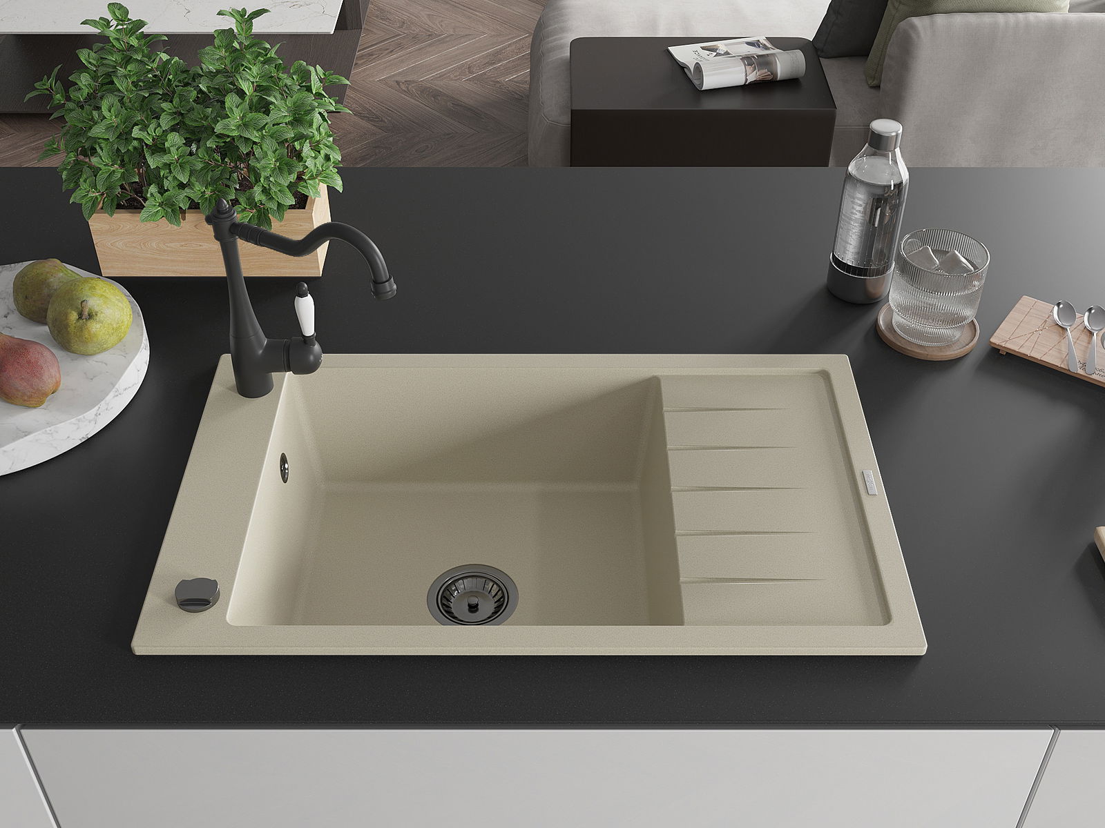 Suprafața chiuvetei este rezistentă la pete și decolorarea, datorită căreia este ușor de curățat și își păstrează culoarea mult timp. Estetică și practic completarea fiecărei bucătării.