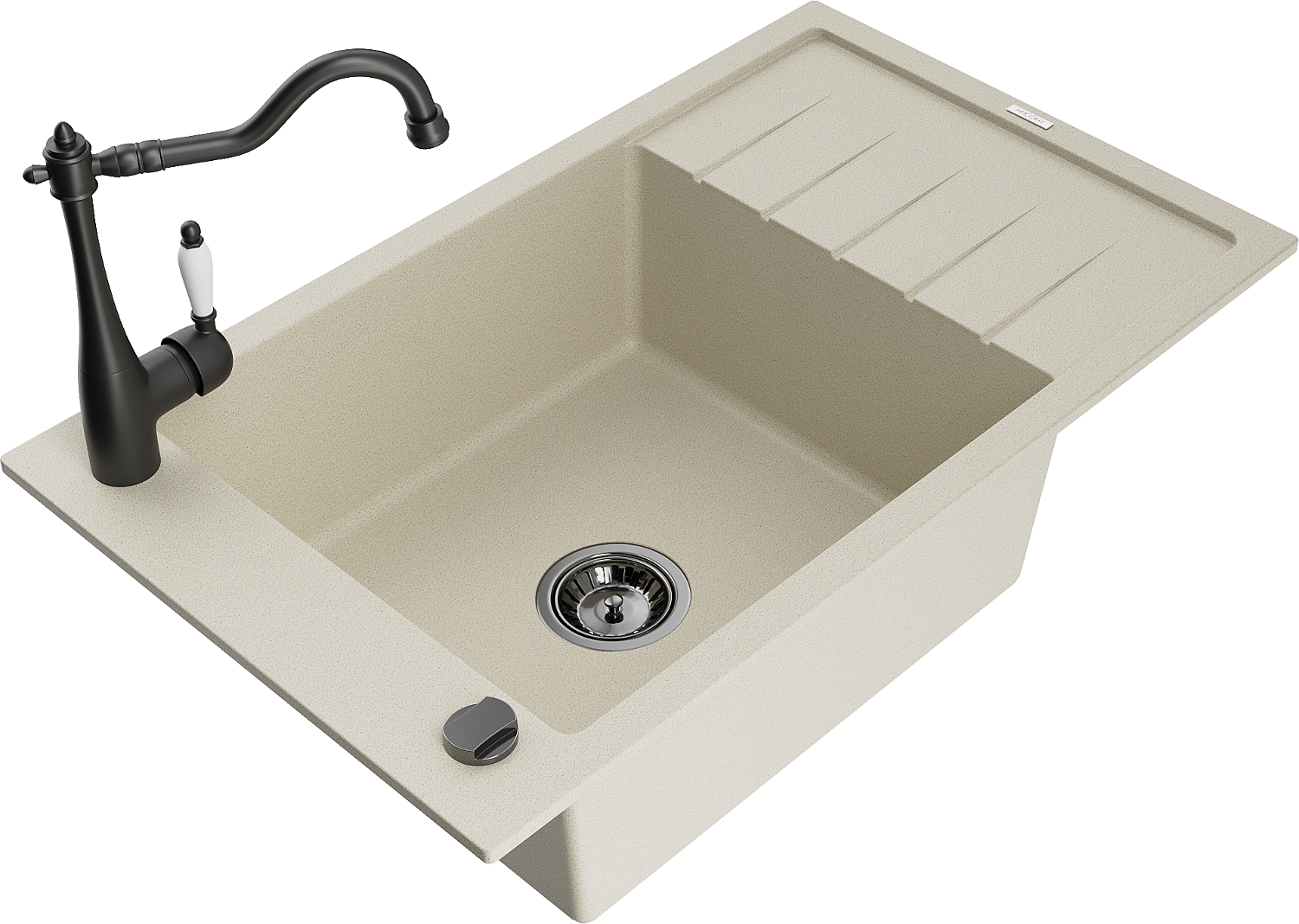 Mexen Elias chiuvetă din granit cu 1 cuvă cu picurător și baterie de bucătărie Carla, bej - 6511-69-670700-70