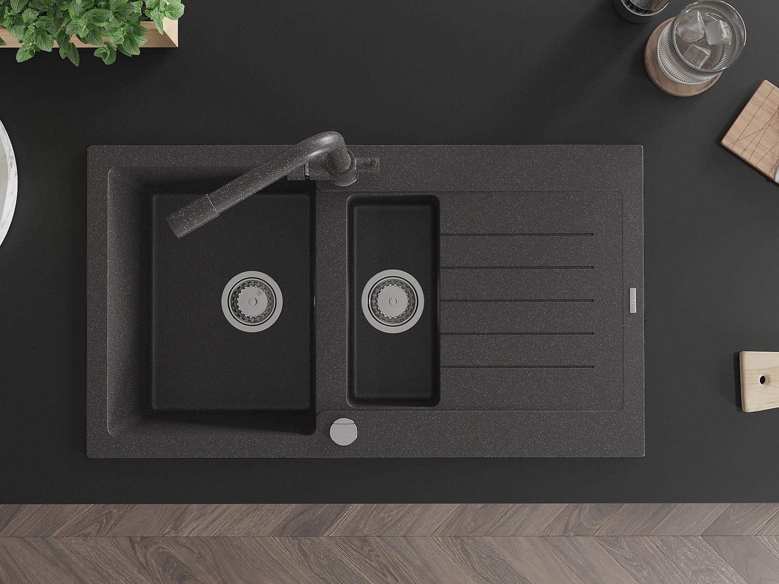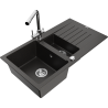 Mexen Matias chiuvetă de bucătărie din granit cu 1,5 cuve, cu scurgător și baterie Duero, negru cu pete - 6502-76-671600-76
