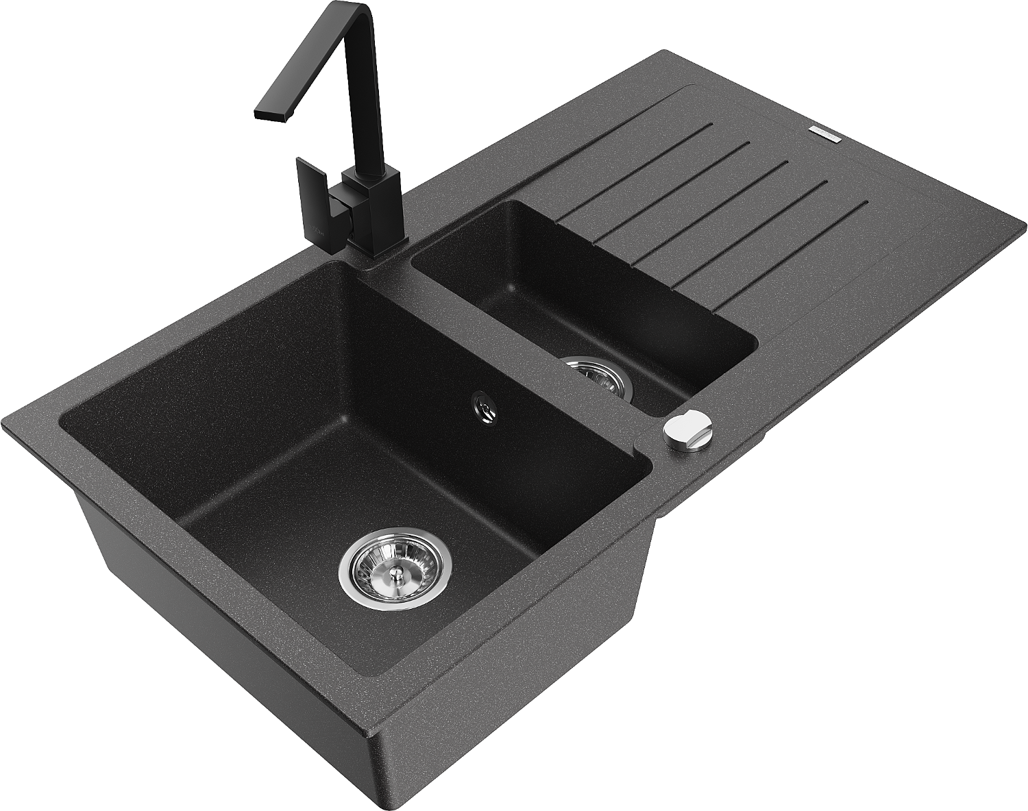 Mexen Matias chiuvetă din granit 1,5 camere cu scurgător și baterie de bucătărie Rita, negru pătat - 6502-76-670300-70