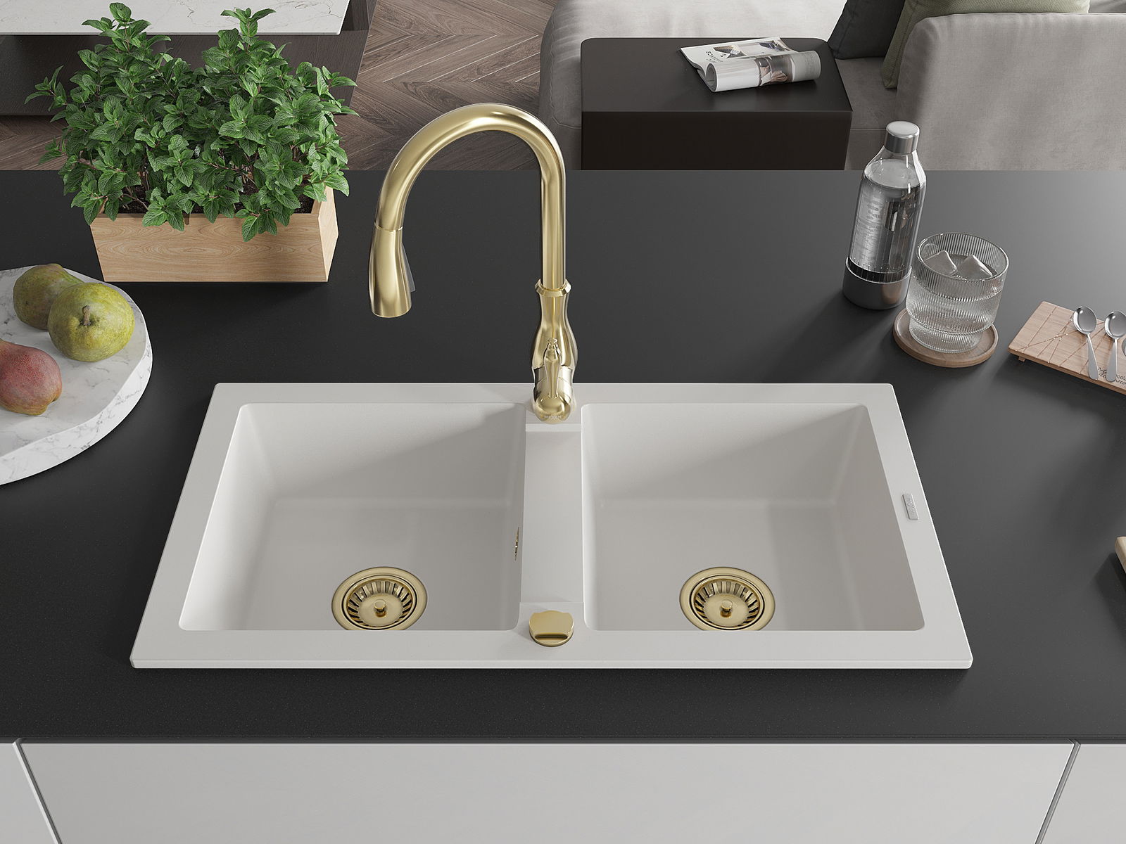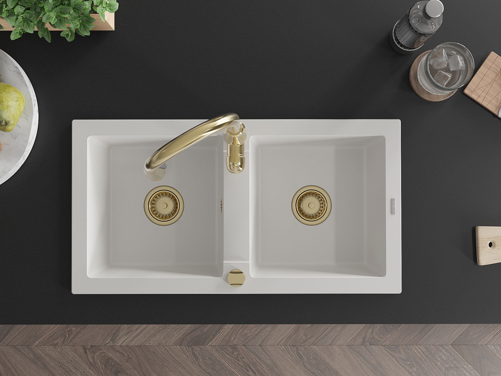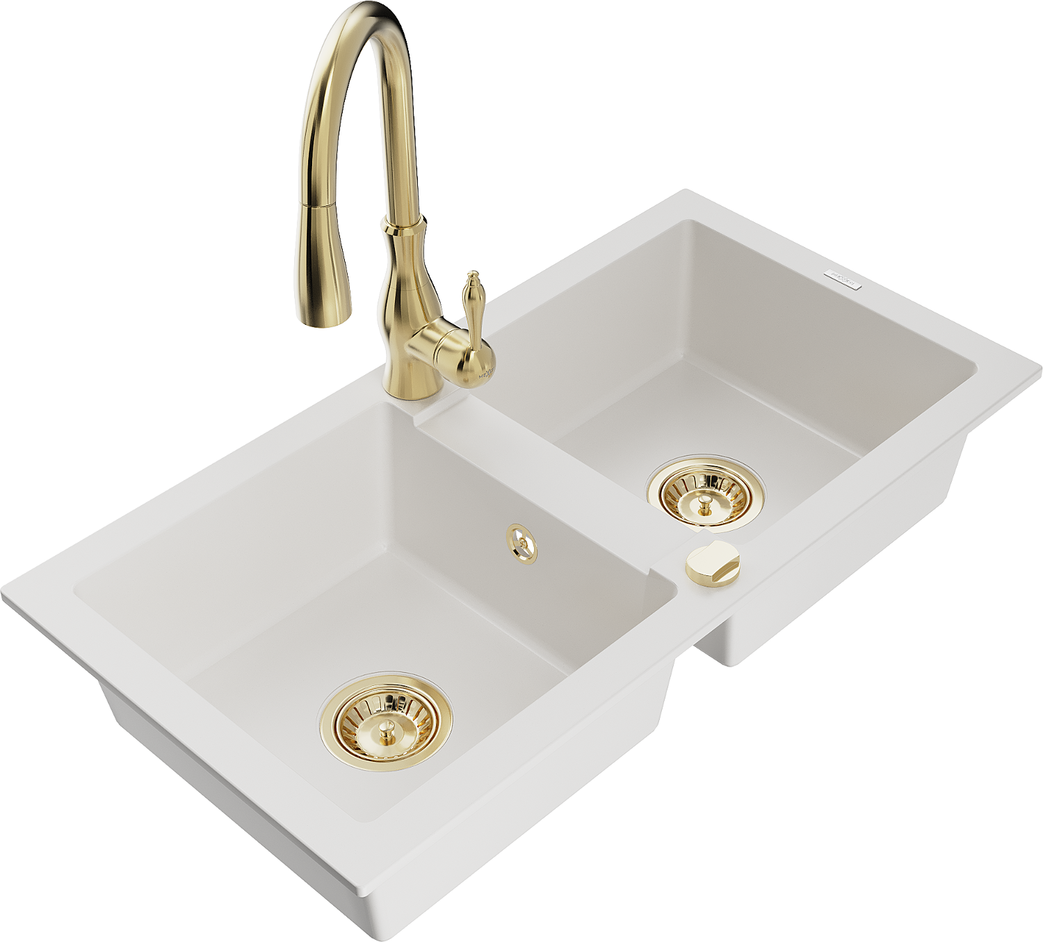 Mexen Mario chiuvetă din granit cu 2 compartimente și baterie de bucătărie Savita, alb - 6504-20-672601-50